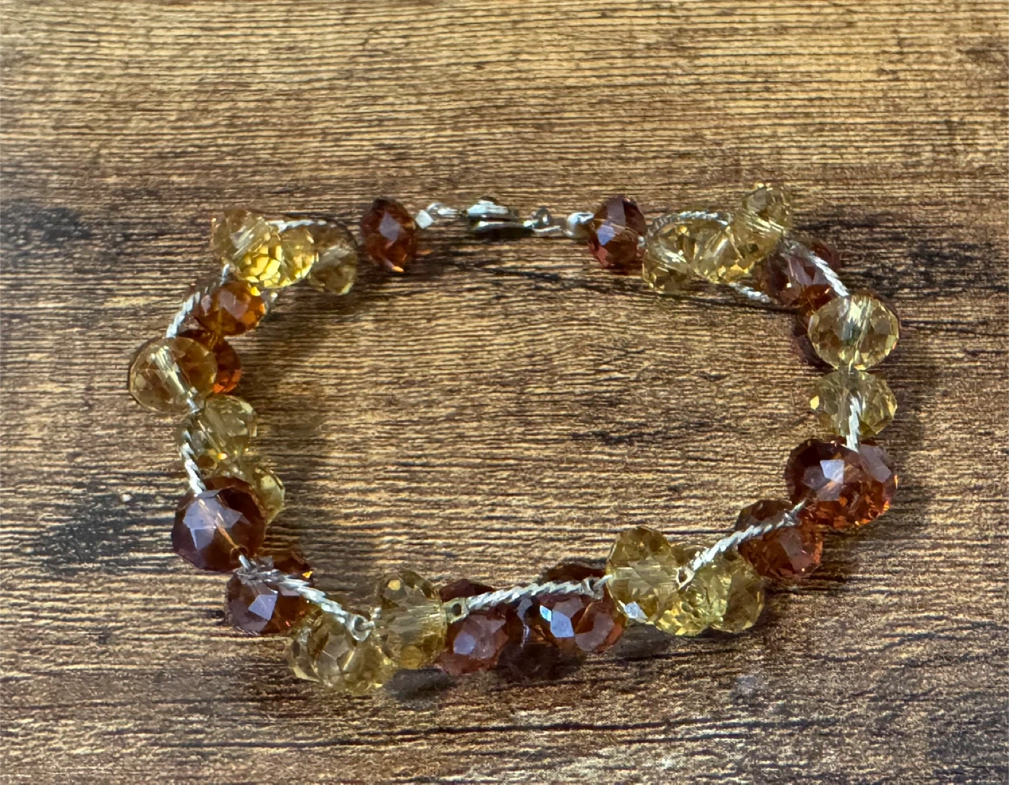 Selling a lovely handmade beaded bracelet. It features a mix of amber and brown coloured beads. Perfect for adding a touch of warmth to any outfit!