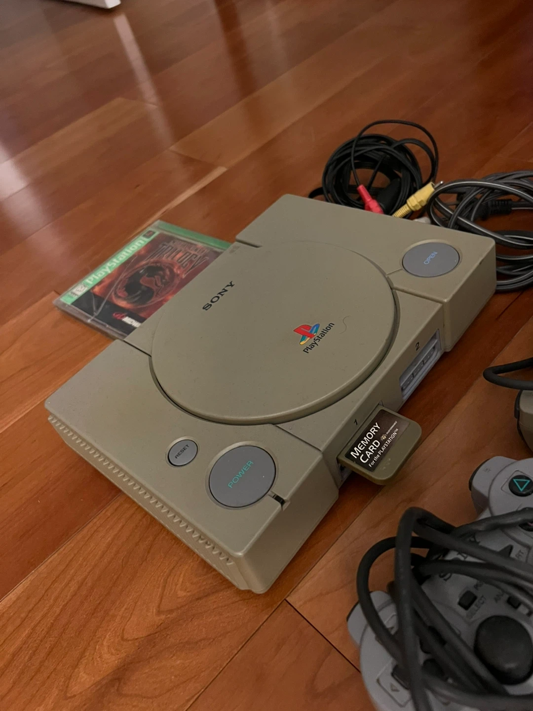 Selling a classic Sony Playstation console! It comes with two controllers, all the necessary cables, a memory card, and the game Mortal Kombat Trilogy. Perfect for reliving some retro gaming memories