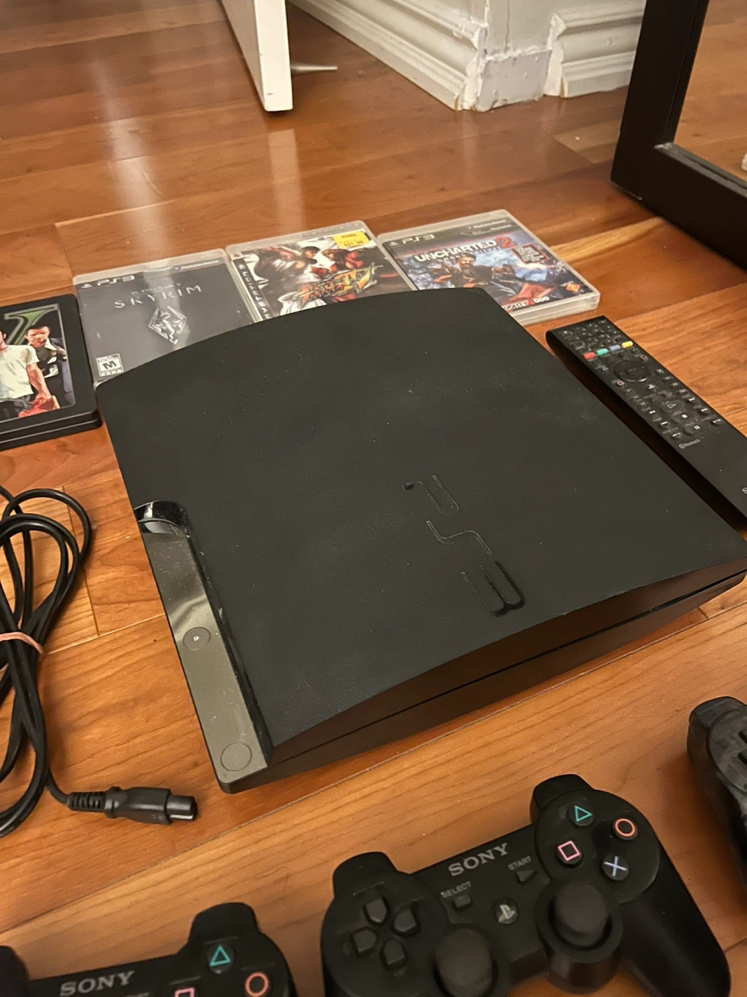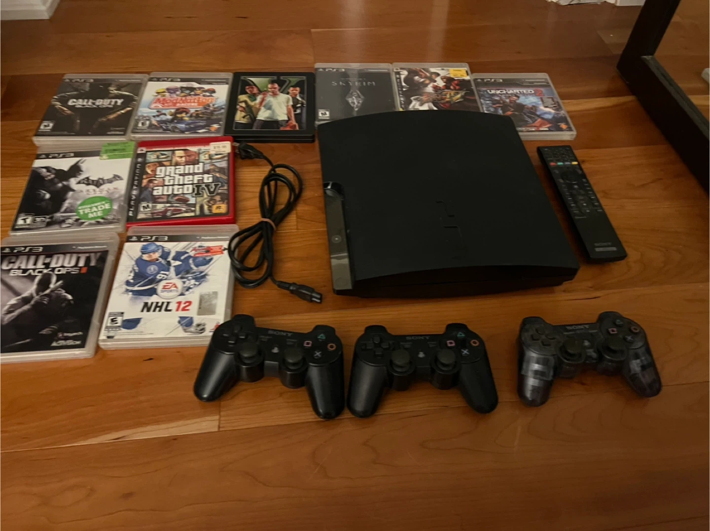 Selling a PlayStation 3 (PS3) console in black, complete with three controllers, a remote, and a selection of games.