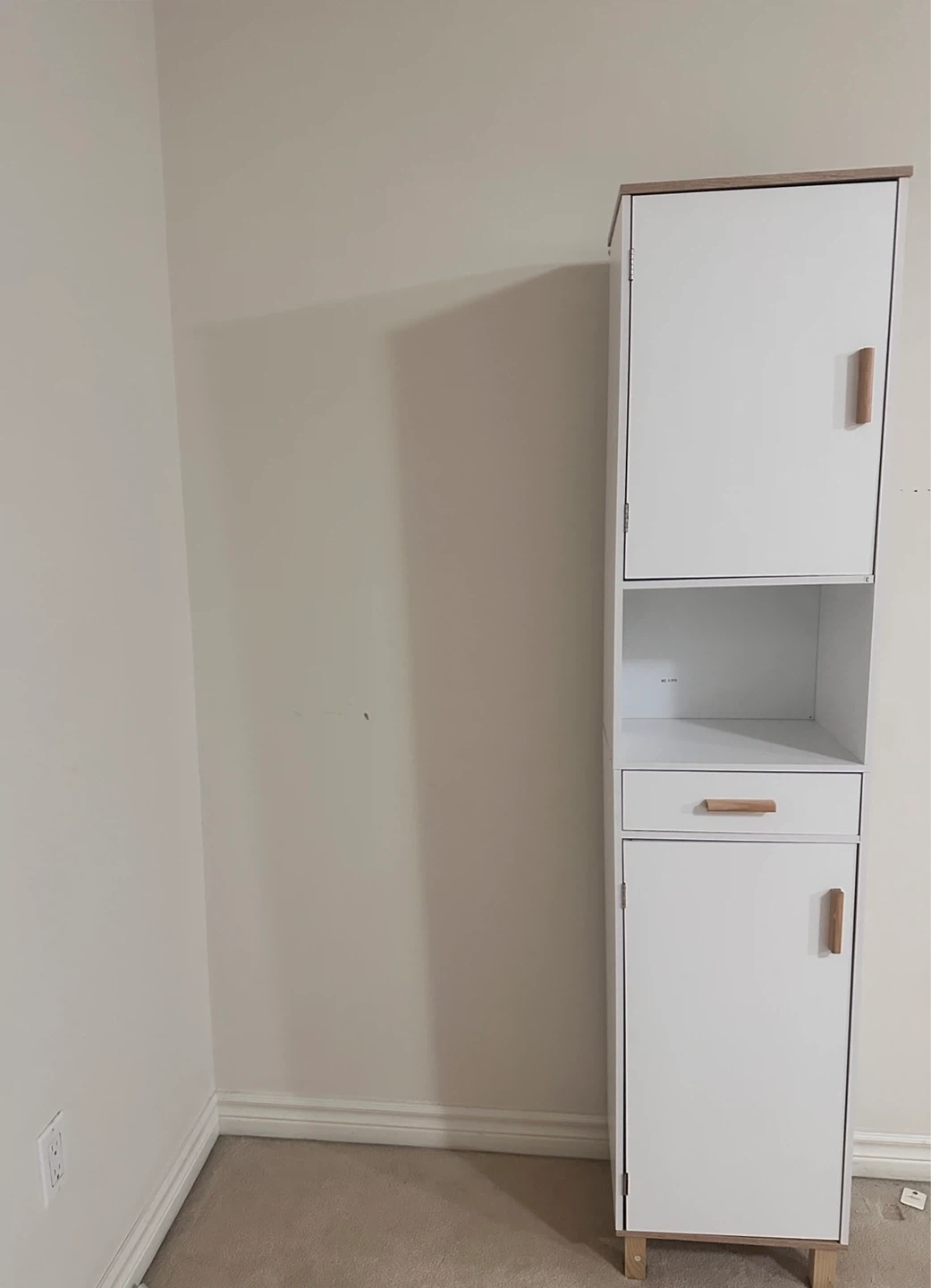 Selling a cabinet in great condition! It's white with wooden handles, offering a clean and simple look. It has a combination of cabinet space, open shelving, and a drawer, making it versatile for storage in any room of your home