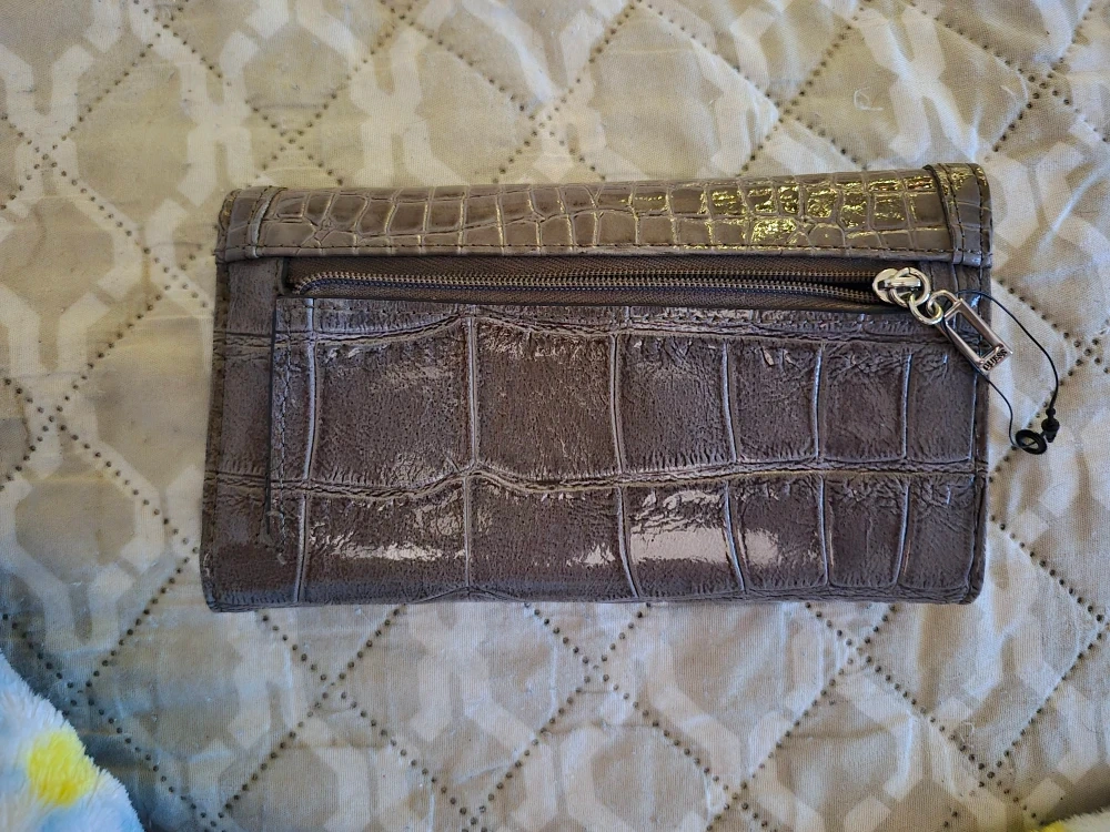 Here's a stylish Guess wallet with a unique crocodile print in a lovely grey colour. It's got plenty of room for cards and cash, and a handy zippered compartment on the back. Perfect for keeping your essentials organized!