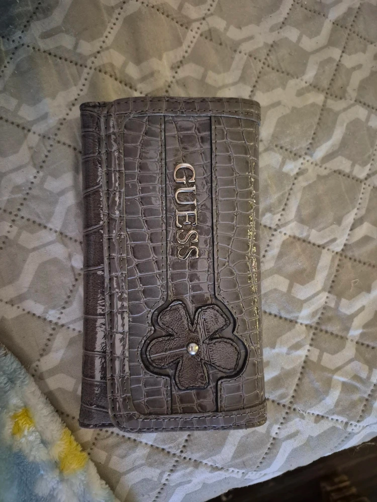 Here's a stylish Guess wallet with a unique crocodile print in a lovely grey colour. It's got plenty of room for cards and cash, and a handy zippered compartment on the back. Perfect for keeping your essentials organized!