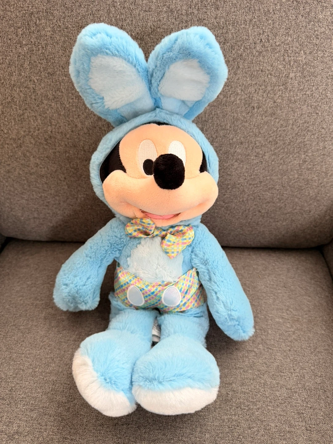 Mickey is dressed as an Easter bunny! It's a light blue colour and measures about 18 inches tall. Perfect for any Disney fan or Easter basket!