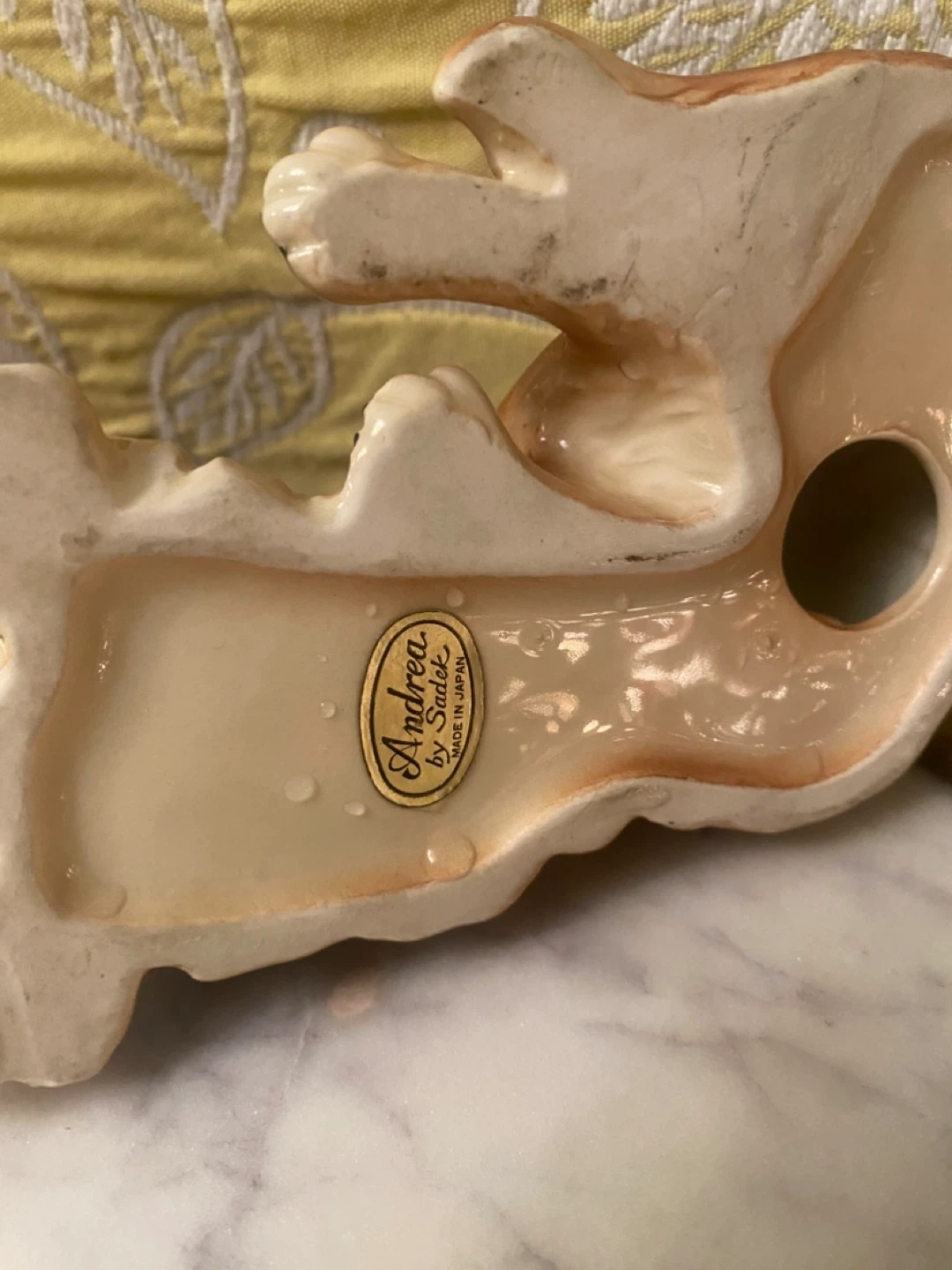 Here's a charming dog figurine by Andrea by Sadek! It's a lovely piece to add to any collection or as a decorative item in your home. The figurine features a brown dog lying on a white marble-like base with a gold rim. It's in great condition and ready to find a new home!