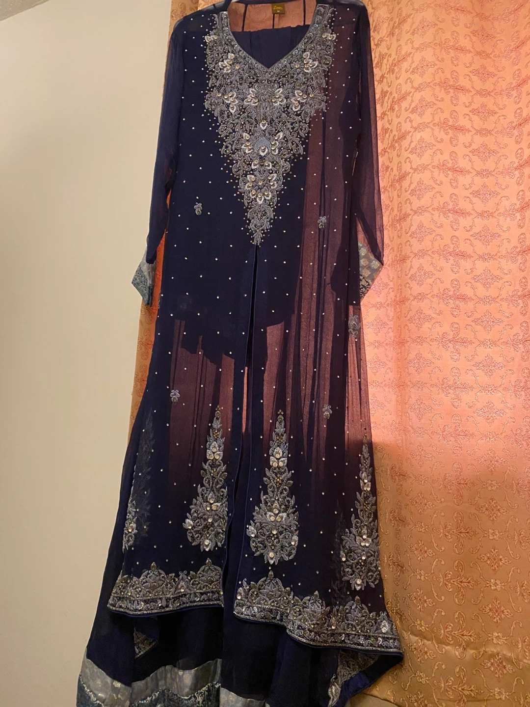 Beautiful navy blue Pakistani suit with intricate silver embroidery. It's in great condition and perfect for a special occasion. The fabric is lightweight and flowy, making it comfortable to wear. The detailed embroidery adds a touch of elegance to the outfit. I hope it finds a good home!