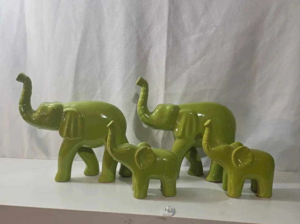 Here's a charming set of four green ceramic elephant figurines! They would look great on a shelf or mantelpiece. There is a small crack on one of the elephants.