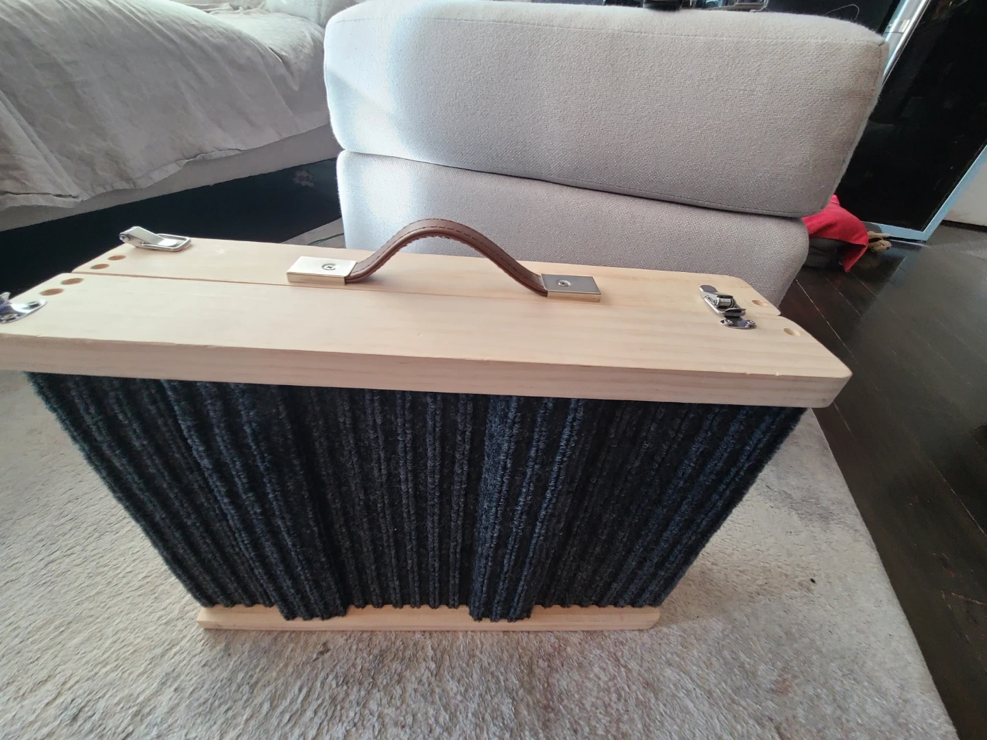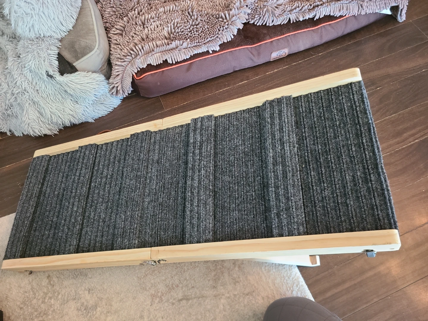 Selling a folding pet ramp, perfect for helping your furry friends reach higher places! It's made with a sturdy wooden frame and a carpeted surface for extra grip. The ramp folds for easy storage and portability. Measures approximately 31 inches when unfolded.