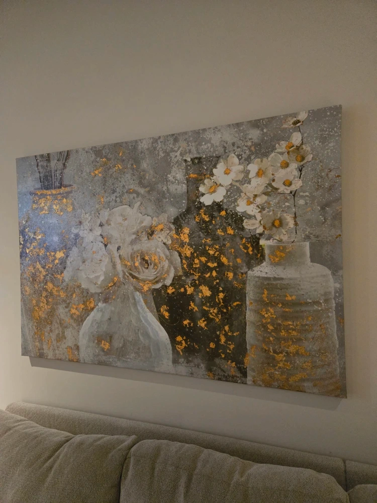 Selling a canvas print featuring a floral and vase design. It's in great condition and would look lovely in any room! The colours are neutral with gold accents.