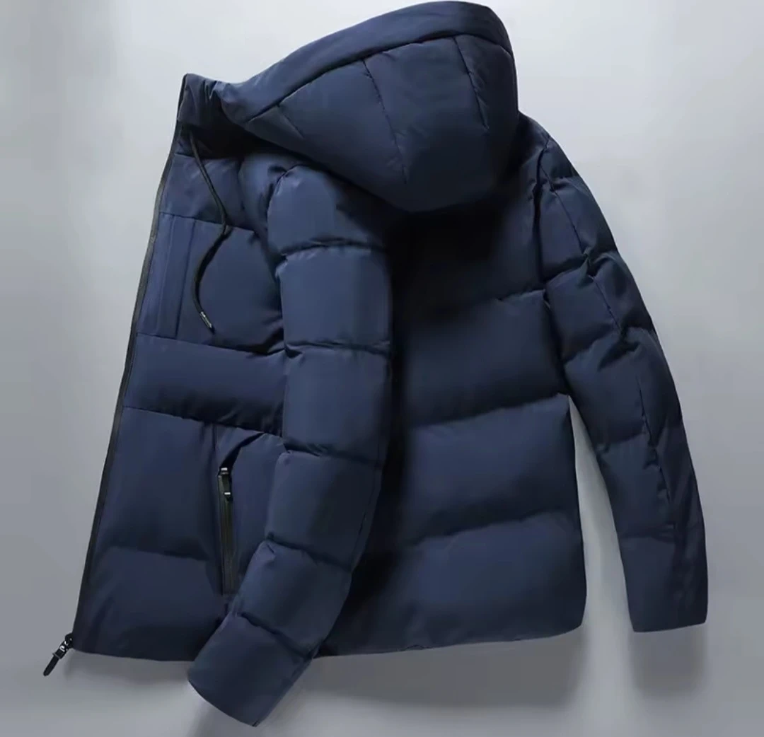 Here's a cozy navy blue puffer jacket! It looks to be in great condition and ready to keep you warm this winter. It features a hood and zippered pockets.