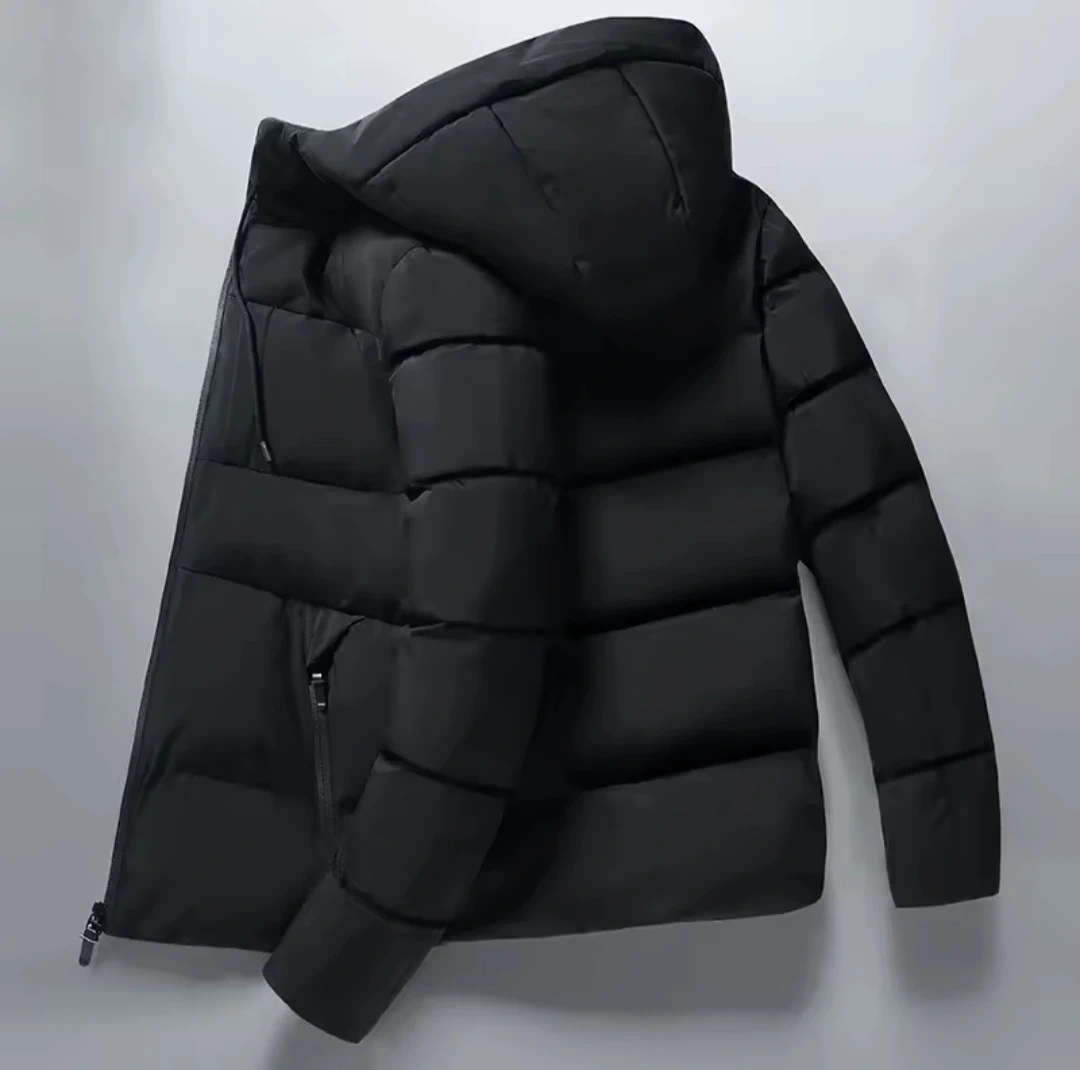 Here's a black puffer jacket, perfect for staying warm during the colder months! It has a hood for extra protection against the elements.
