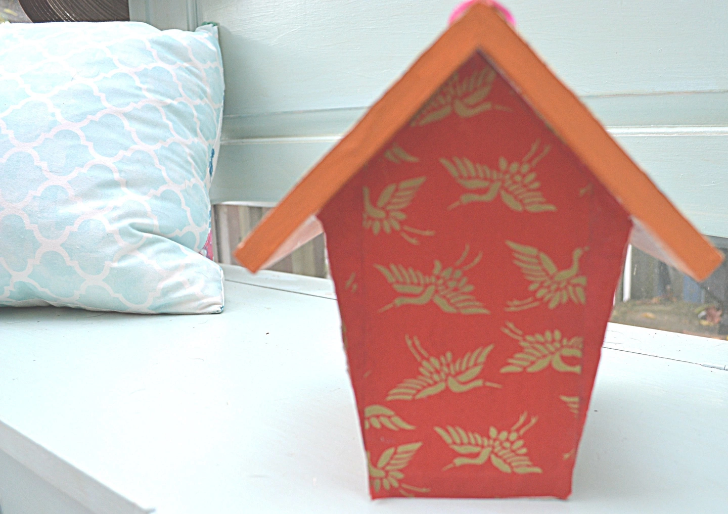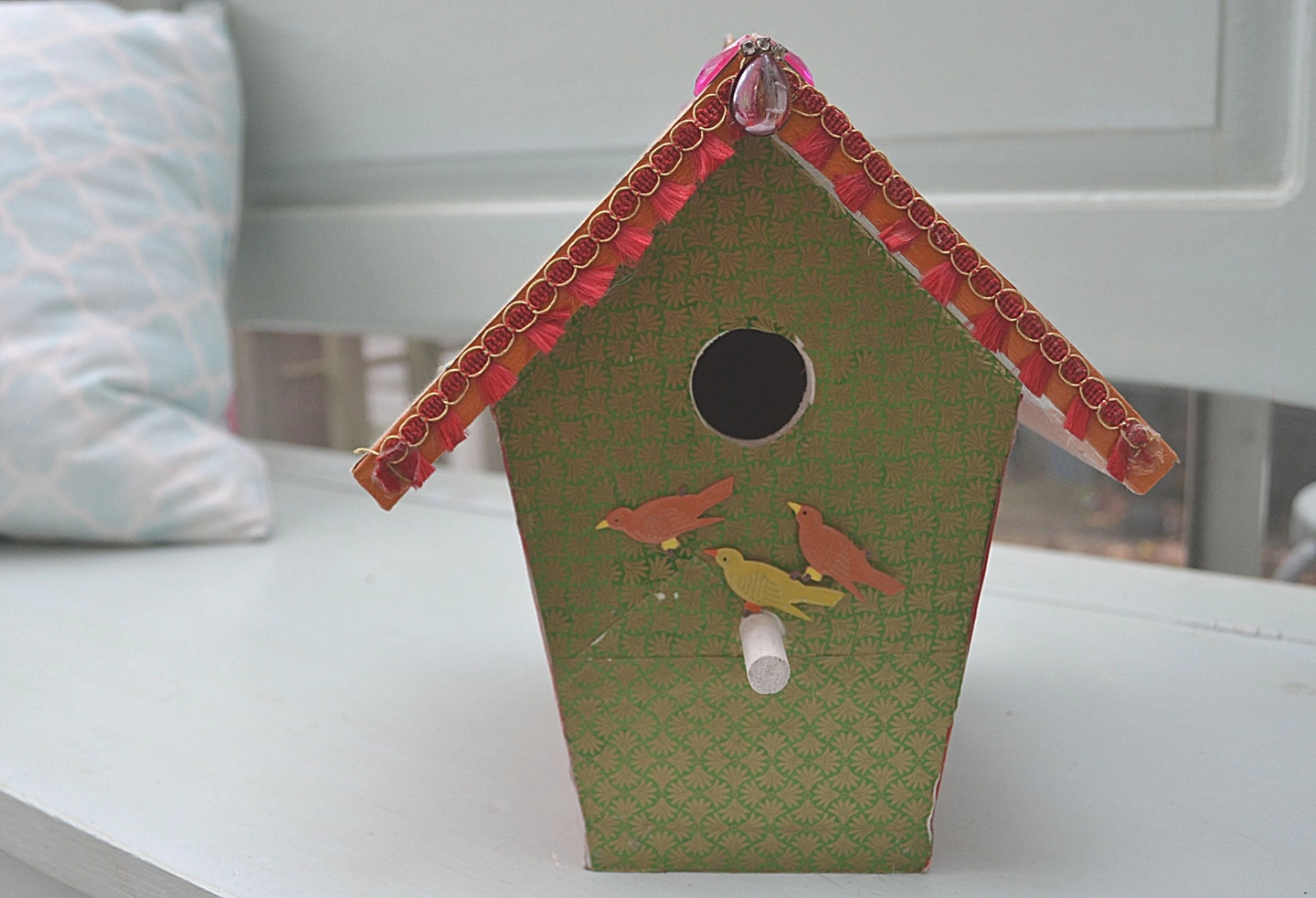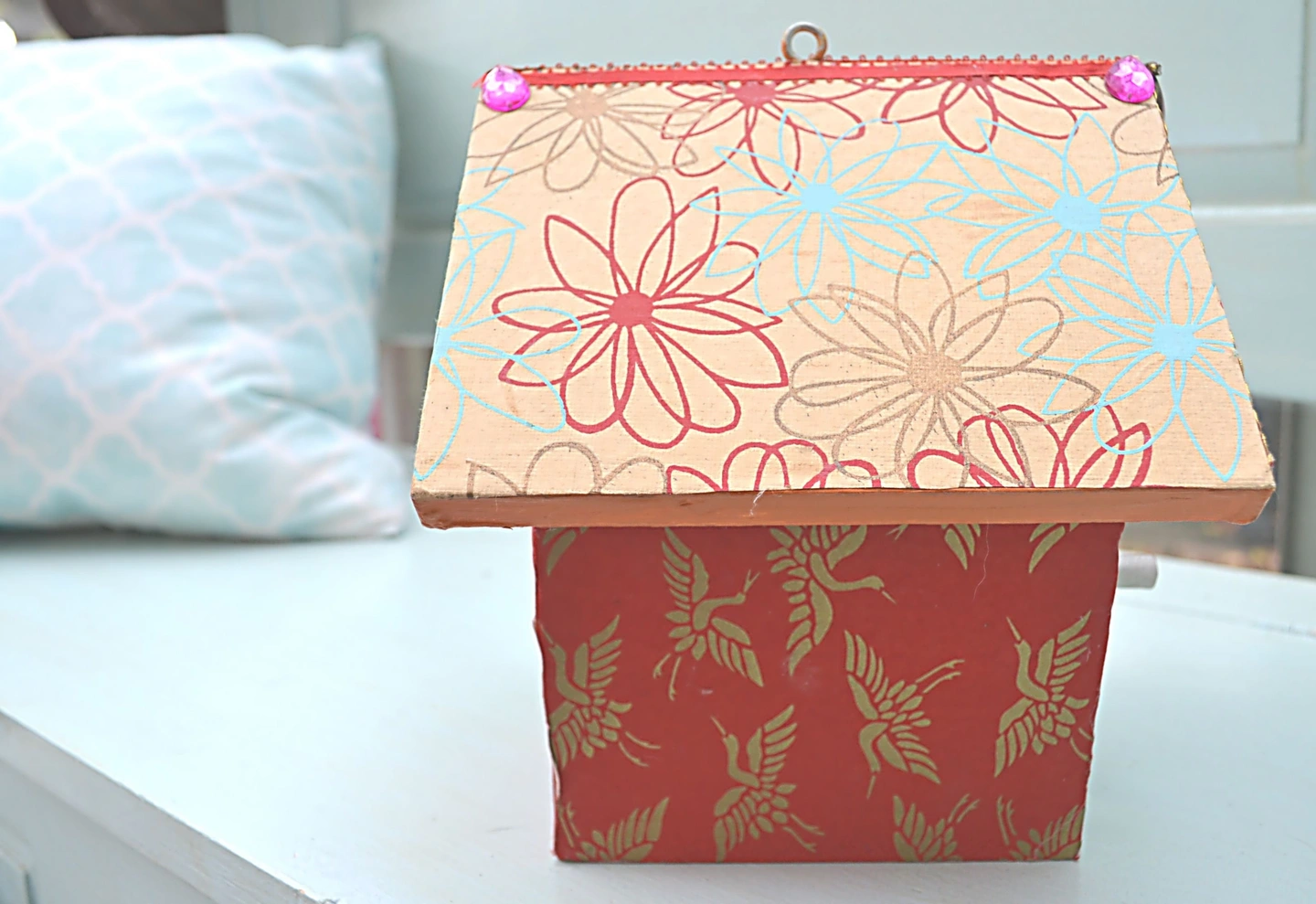 Very cute handmade wooden birdhouse (not intended for outdoors as it is covered in paper). Features whimsical details such as metal birds, fringe and jewels. Has an eye hook for hanging if so desired.