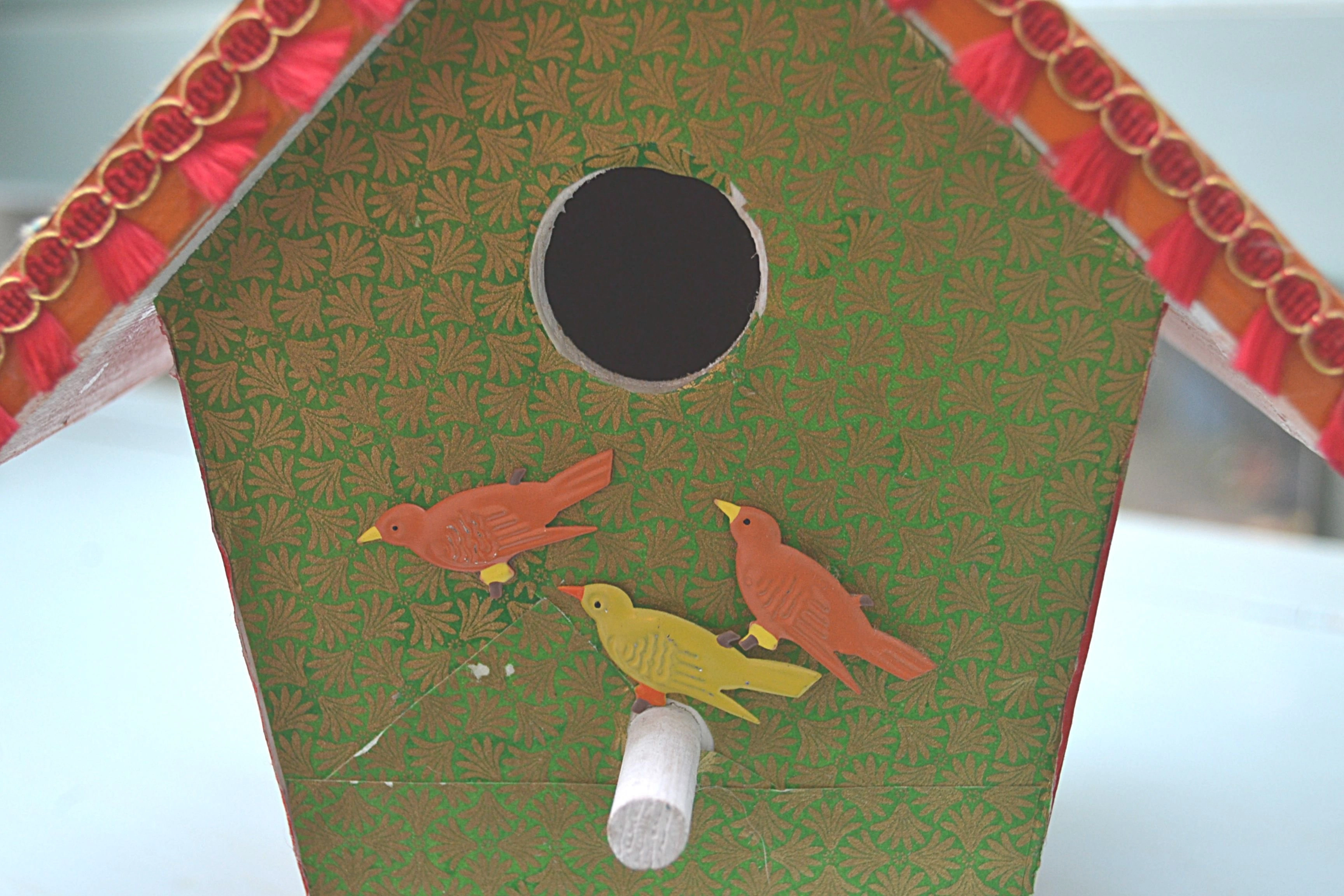 Very cute handmade wooden birdhouse (not intended for outdoors as it is covered in paper). Features whimsical details such as metal birds, fringe and jewels. Has an eye hook for hanging if so desired.