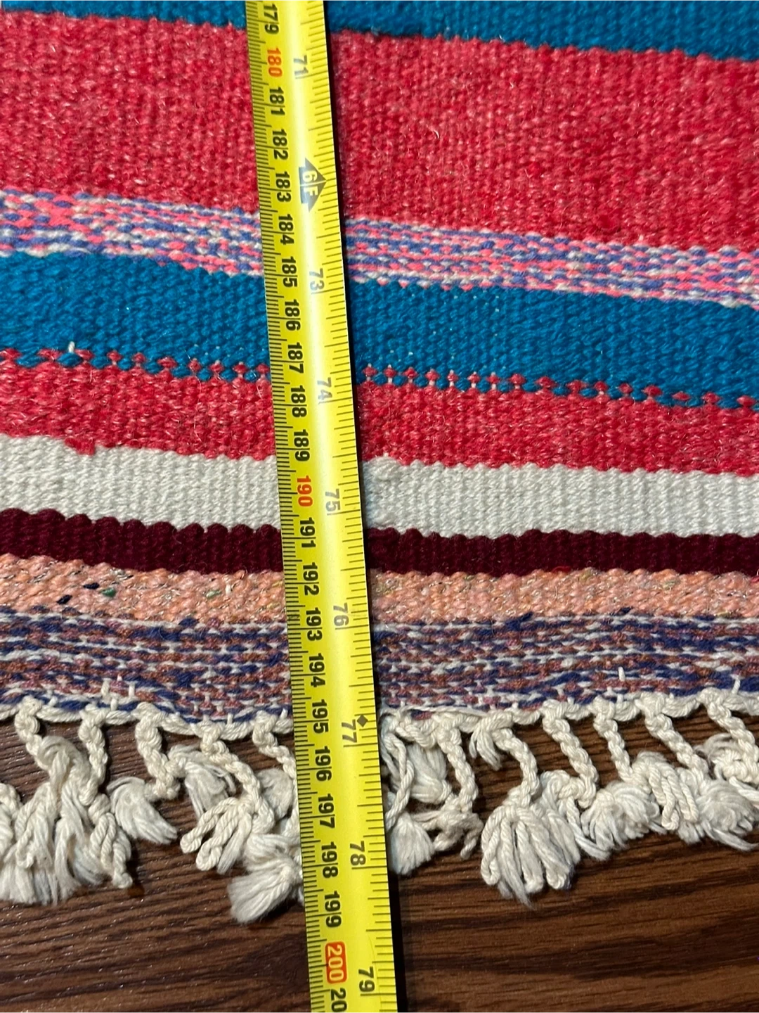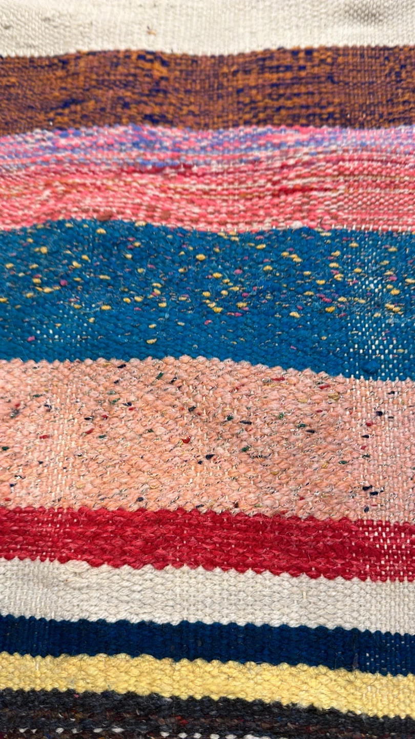 I'm selling a colourful striped area rug! It features a variety of colours in horizontal stripes. The rug measures approximately 71 inches in length and 47 inches in width. It's in great condition and would add a vibrant touch to any room!
