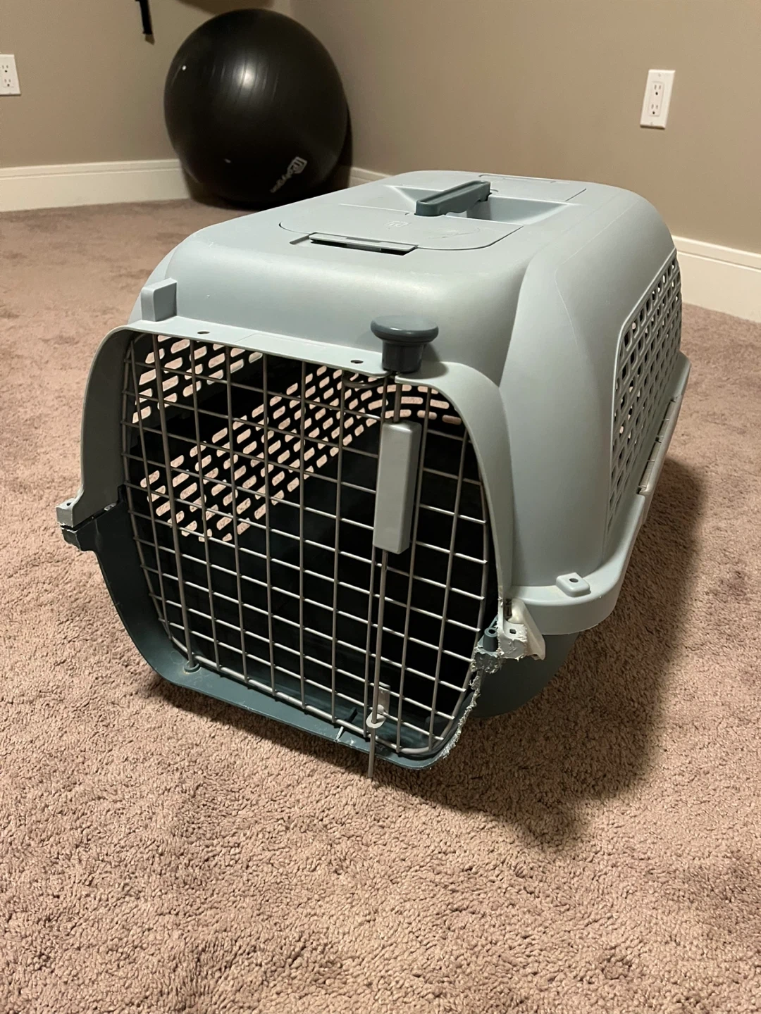 Selling a hard sided pet carrier / crate. It has some chewing damage on the bottom right corner, as shown in the pictures. Comes apart for easy cleaning. Good for travel or crate training. Dimensions 15” high 15” wide 24” long.