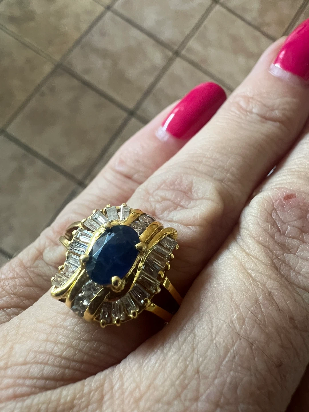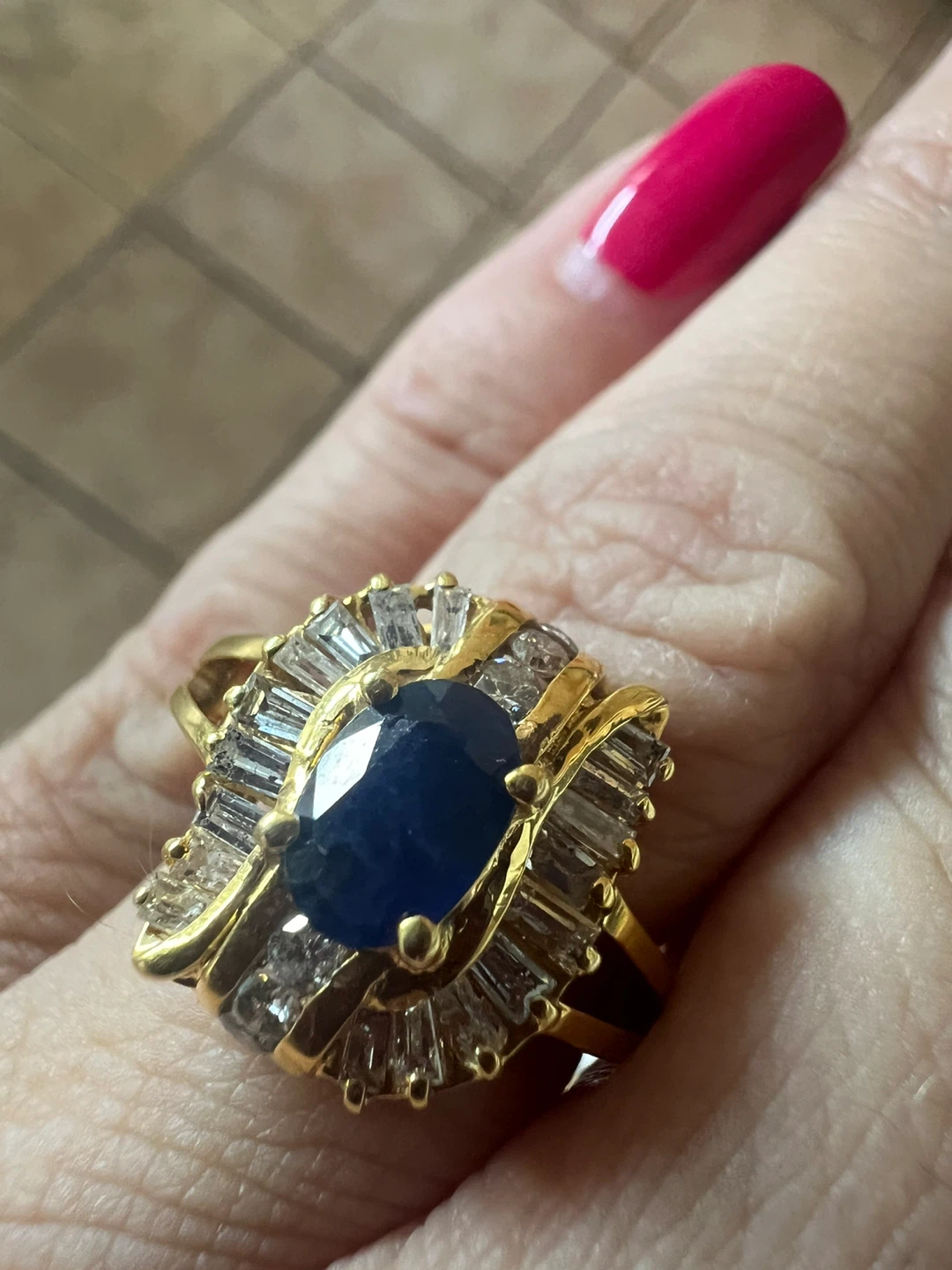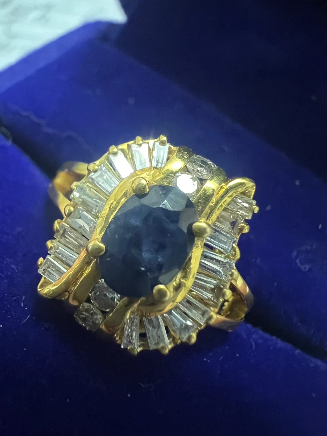 Here's a beautiful 14 k ring featuring a sapphire surrounded by diamonds set in gold. It's a stunning piece that would make a lovely addition to any jewellery collection!