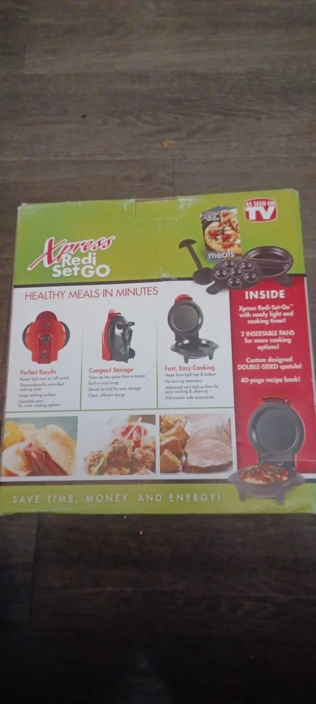 I'm selling an Xpress Redi Set Go, perfect for making healthy meals in minutes! It comes with ready light and cooking timer, non-stick surface, and compact storage. The box includes 2 insertable pans for more cooking options and a custom designed double-sided special 40-page recipe book! Save time, money, and energy with this handy appliance