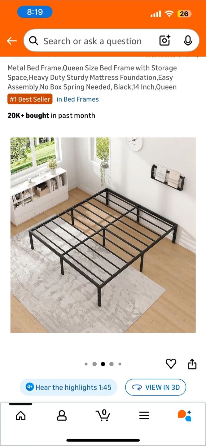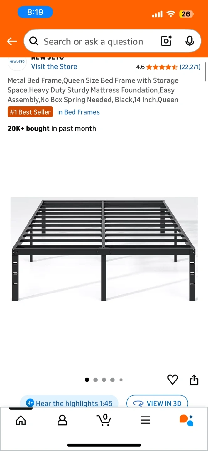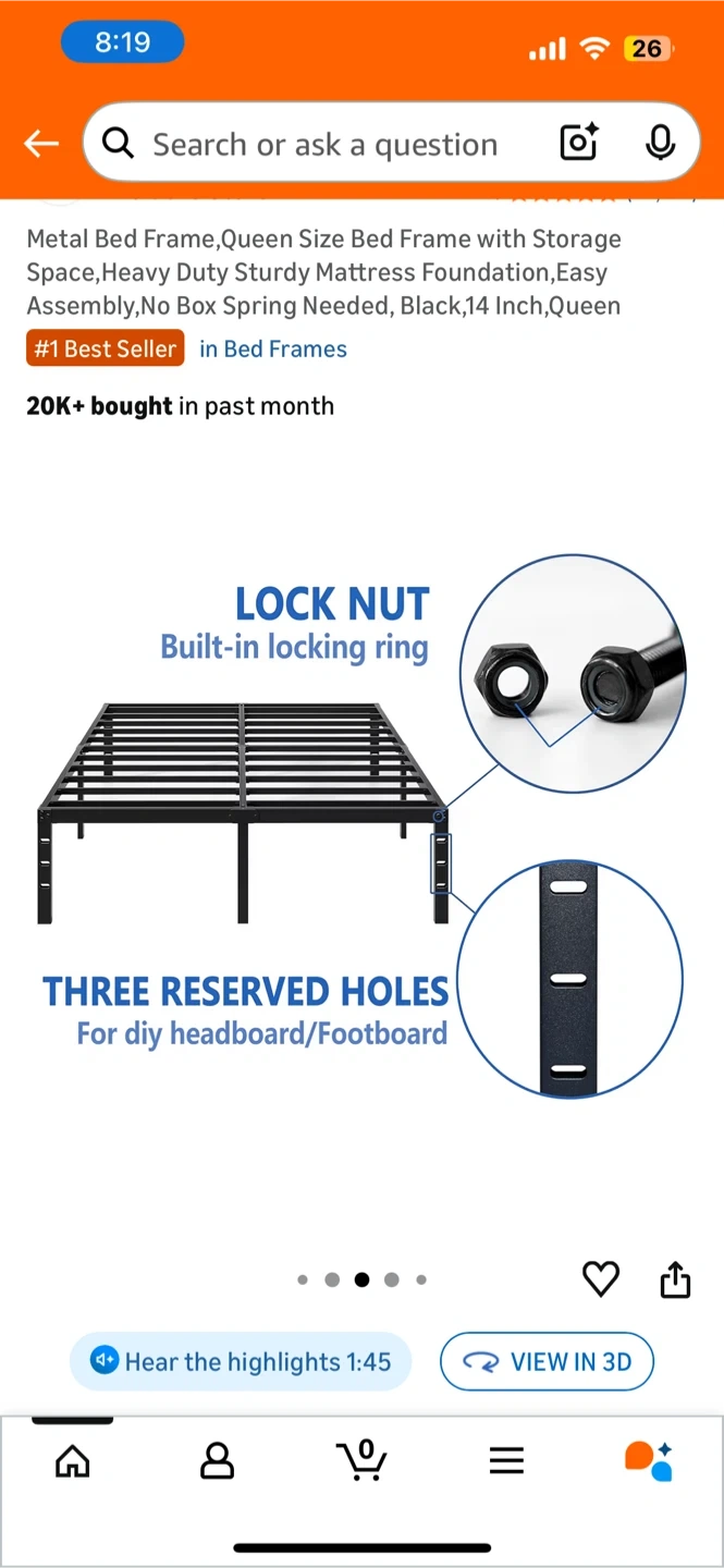 Selling a queen size metal bed frame in black, 14 inches tall. It's a sturdy mattress foundation that's easy to assemble and doesn't require a box spring. It also features storage space underneath. Has built-in locking ring and three reserved holes for diy headboard/Footboard