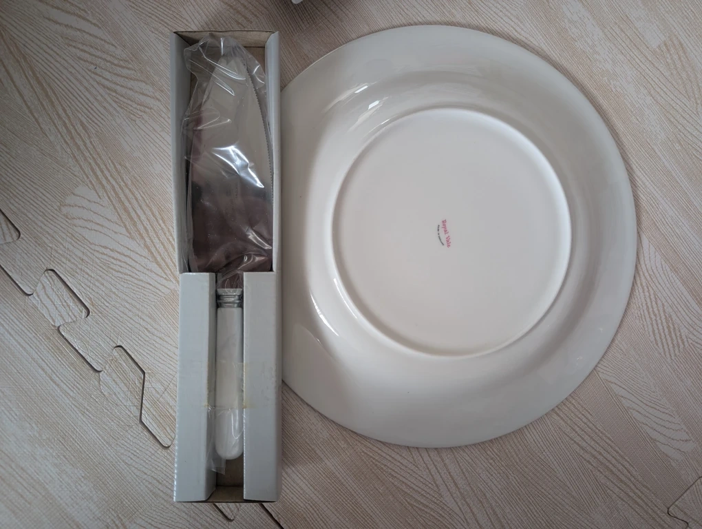I have a brand new Royal Vale English China Cake Set for sale! It comes complete with a cake plate and server, all in the original box. The set features a beautiful floral design, perfect for adding a touch of elegance to any occasion.