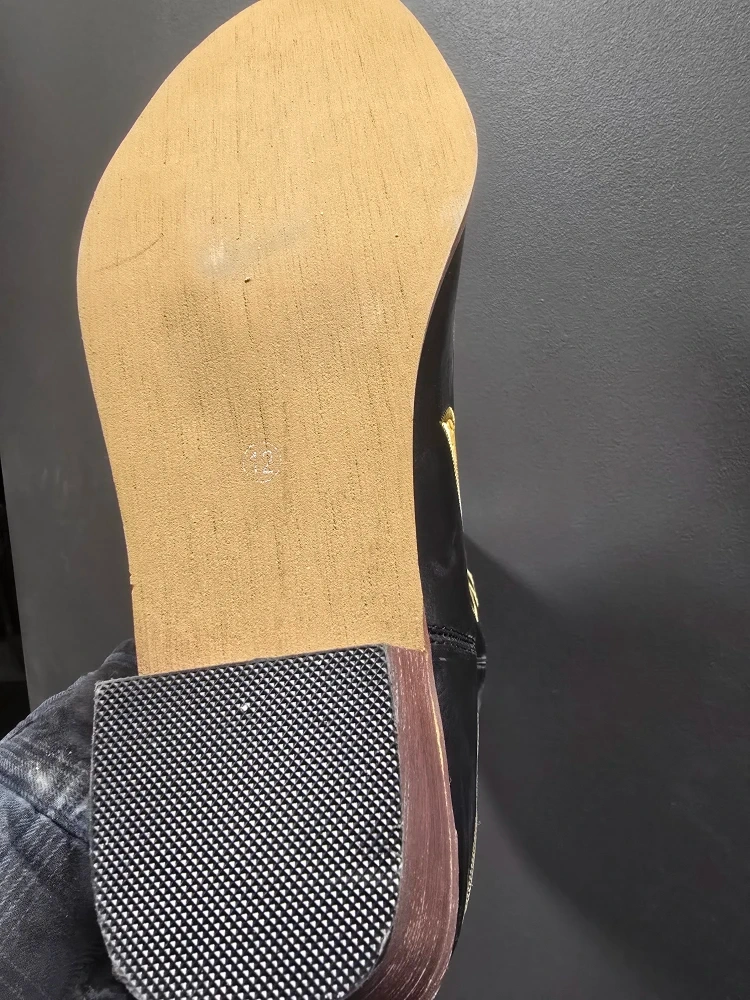 Selling a pair of stylish cowboy boots in black and yellow. They look great and are in good condition. The size is marked as 12.
