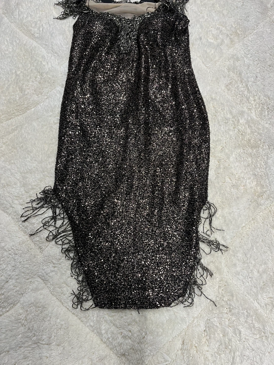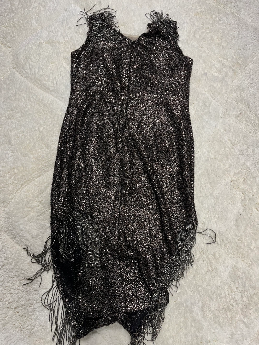 This is a beautiful sequin dress with fringe detailing! It's perfect for a night out or a special occasion. The dress is in great condition and ready for a new owner!