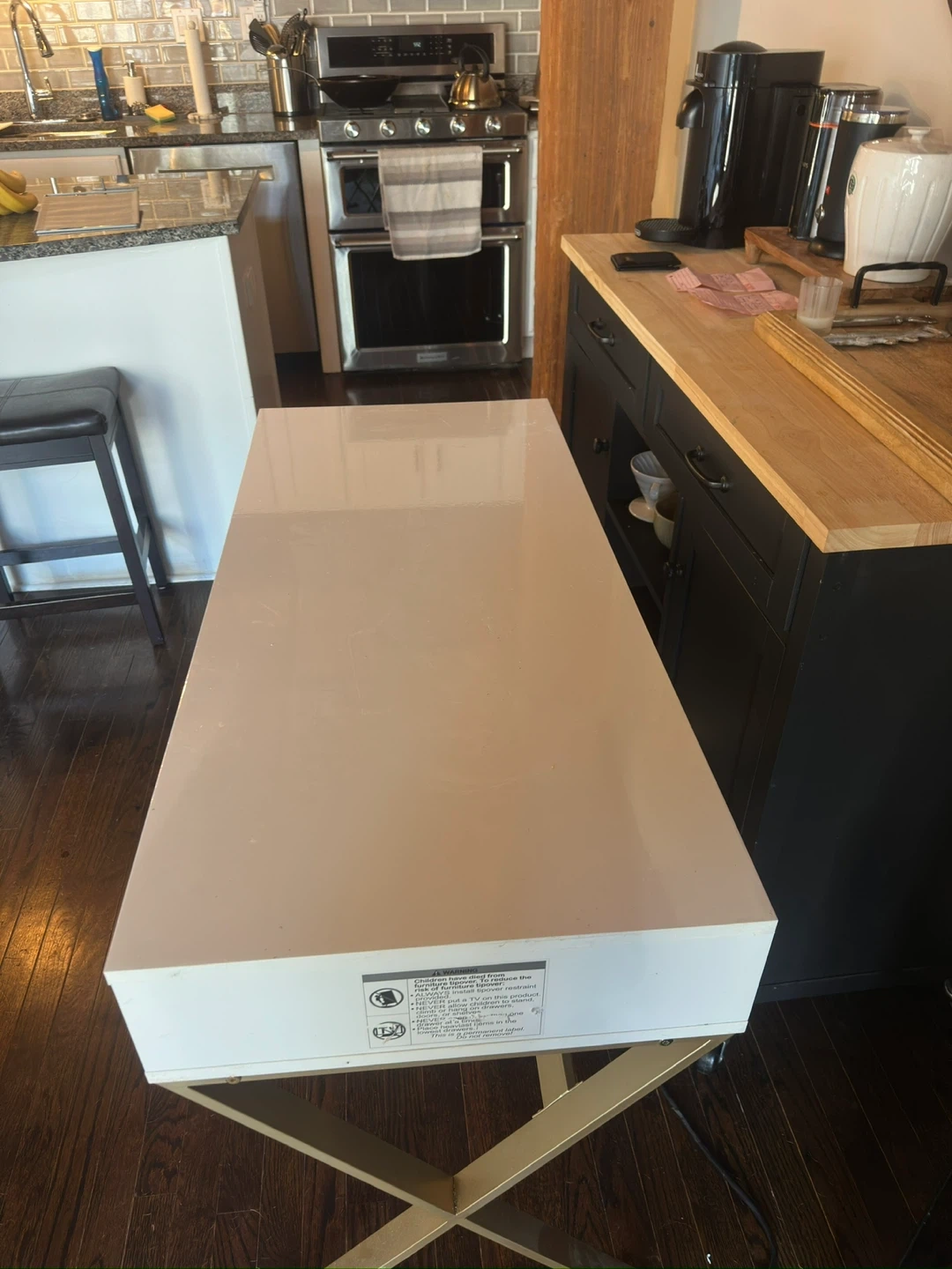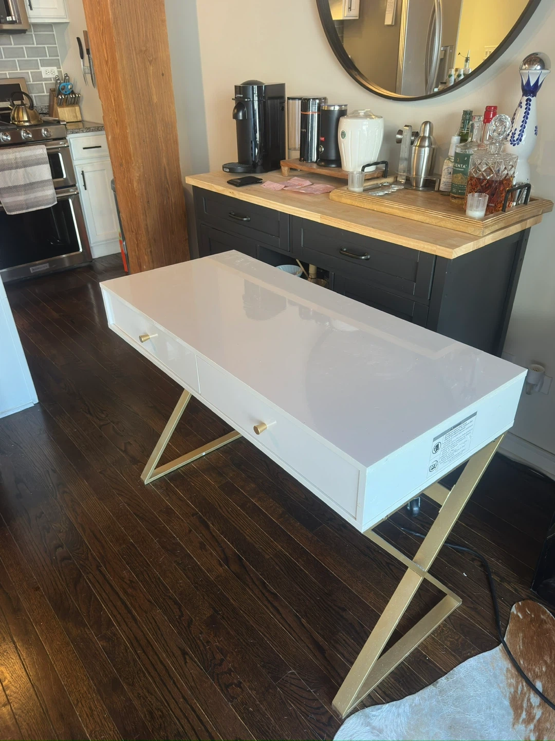 Selling a stylish desk with a white top and gold legs. It's in great condition and would look great in any home office or living space! The desk features a sleek design with clean lines, perfect for a modern aesthetic