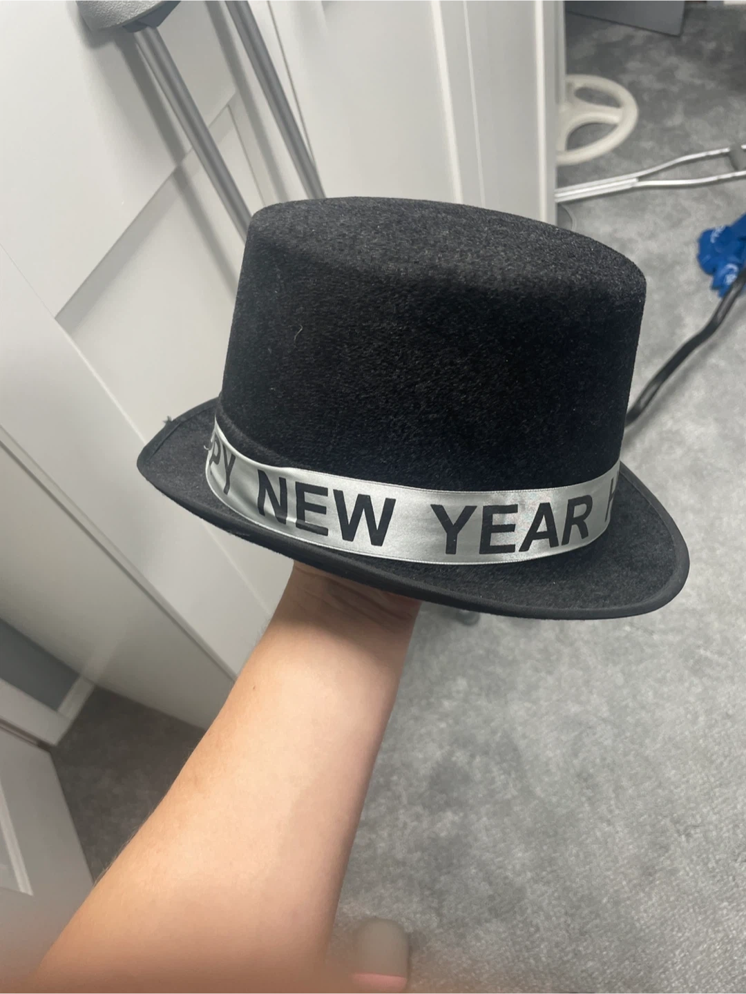 Get ready to ring in the New Year with this fun black top hat! It's perfect for parties and celebrations. The hat features a silver band with "Happy New Year" printed on it, adding a festive touch to your outfit. Grab it now and make your New Year's Eve unforgettable