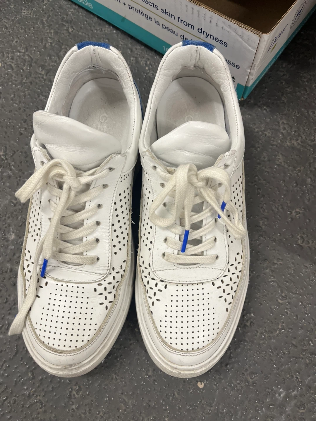 Selling a pair of Geox white leather sneakers. They have a stylish, perforated design and blue accents. They're in good condition and ready for a new owner!