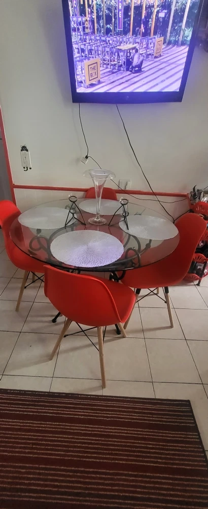 Selling a dining table with a glass top and four vibrant red chairs. The chairs have a modern design with wooden legs. It's a great set for a smaller dining area or kitchen nook!