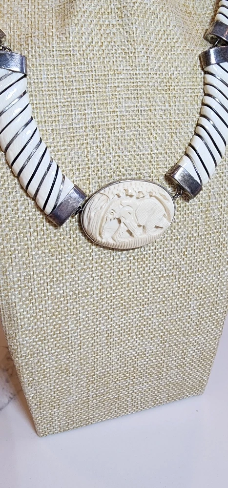 Beautiful vintage necklace featuring hand-carved bone segments and a detailed elephant scene centerpiece. Artisan-made, likely from the 70s. Unique, bold, and perfect for collectors or anyone who loves ethnic/tribal-style jewelry.