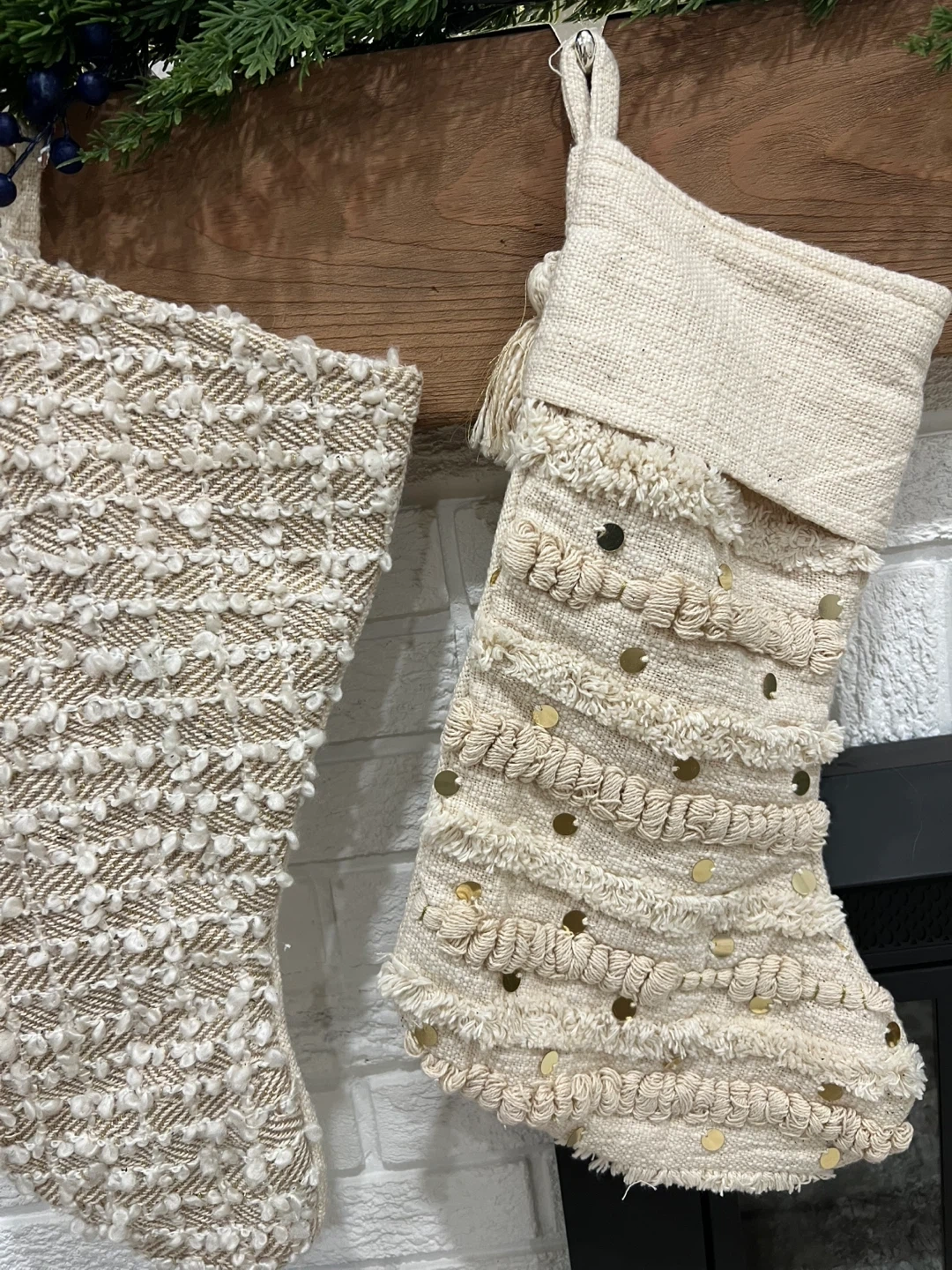 Here's a set of two decorative Christmas stockings! They're in great condition and ready to add a touch of cozy charm to your holiday decor. One is a textured weave pattern, and the other has cute fringe and little gold accents. Perfect for hanging by the fireplace!