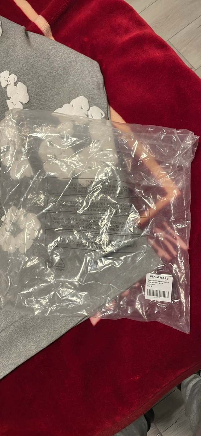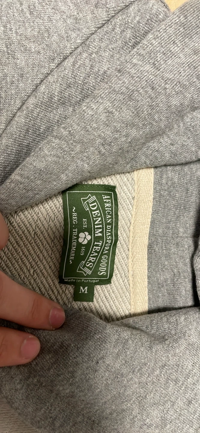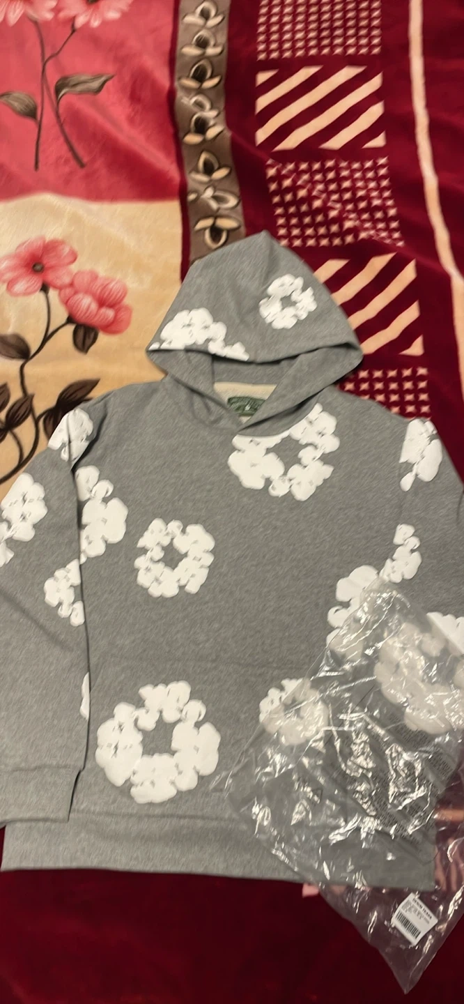 Selling a Denim Tears hoodie in size medium. It's grey with a white floral pattern. The hoodie is still in its original packaging!