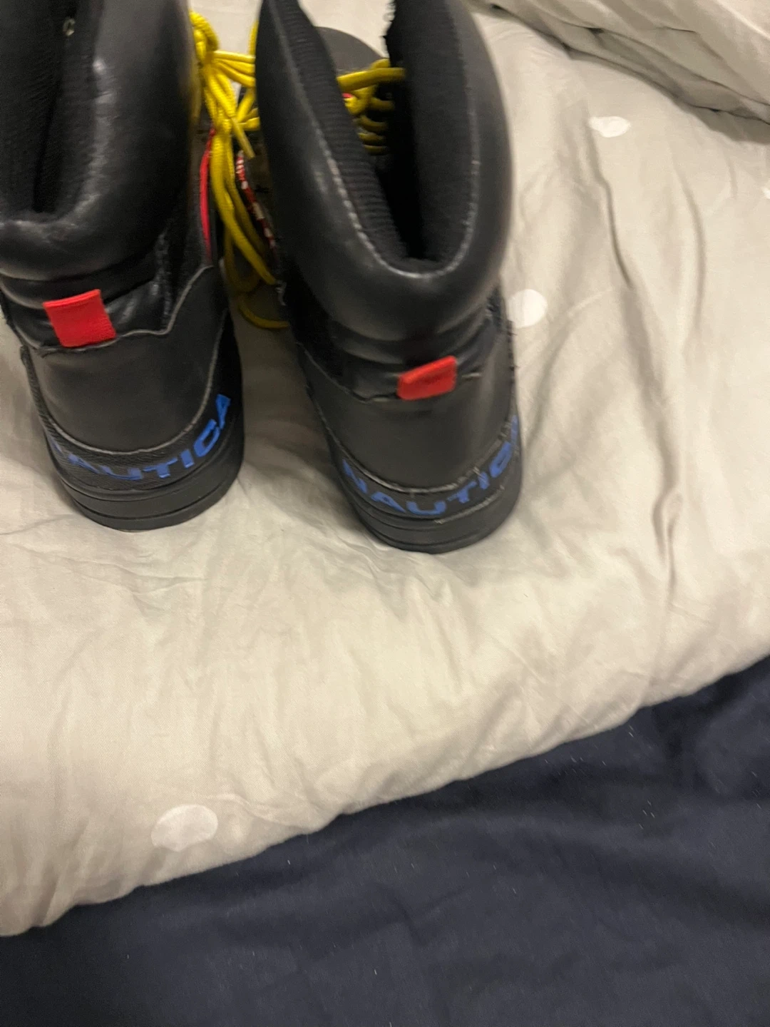 Selling a pair of black Nautica boots in size 12 US. They feature yellow laces and some red accents. Please take a look at the pictures for the condition!