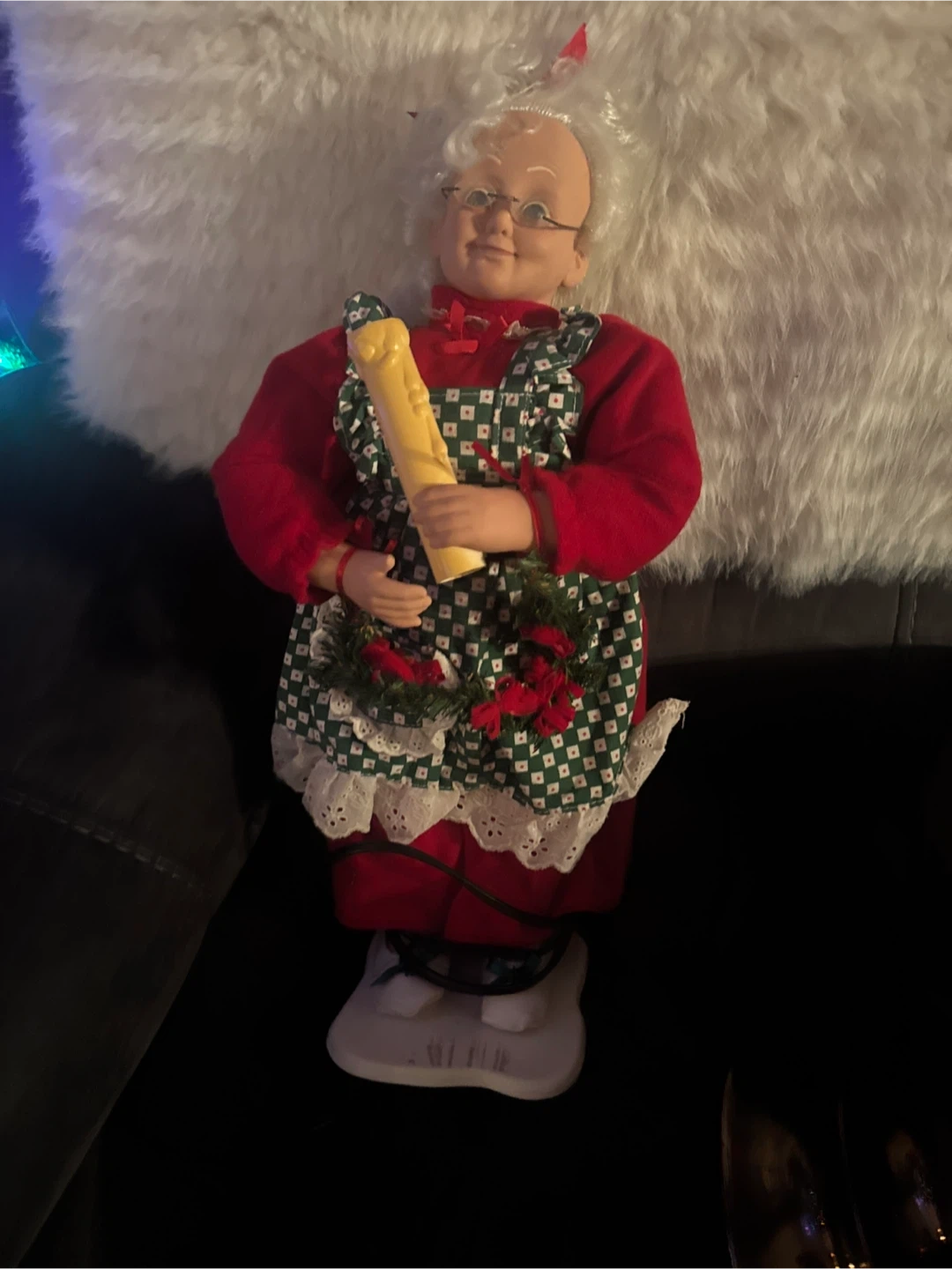 giving away an animated Mrs. Claus doll. She's wearing a red dress with a green and white apron and holding a wreath and candle. A cute addition to your holiday decor!