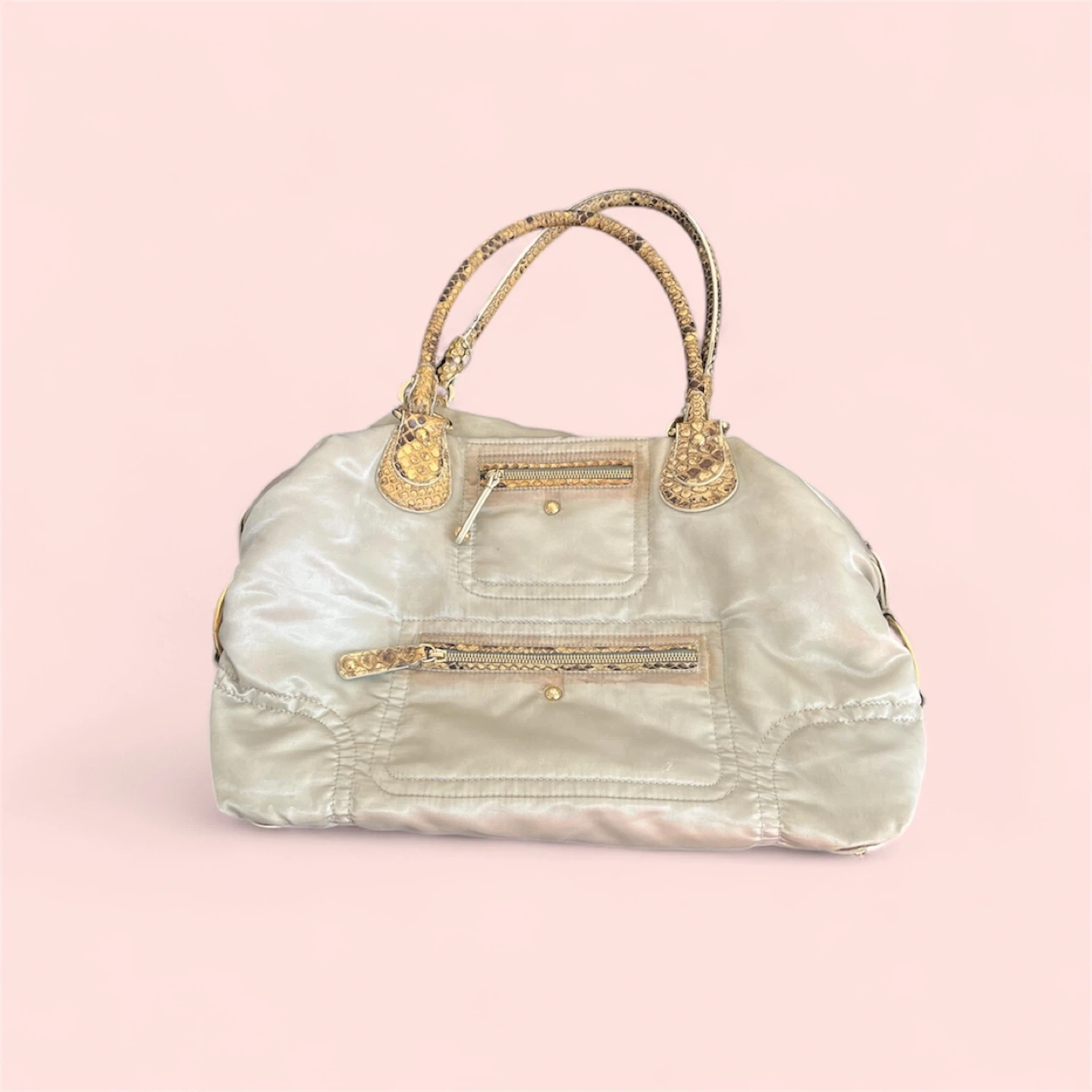 Here's a stylish Tod's handbag up for grabs! It features a unique snakeskin trim on the handles and accents, adding a touch of luxury to the beige leather. It's perfect for carrying your essentials in style!