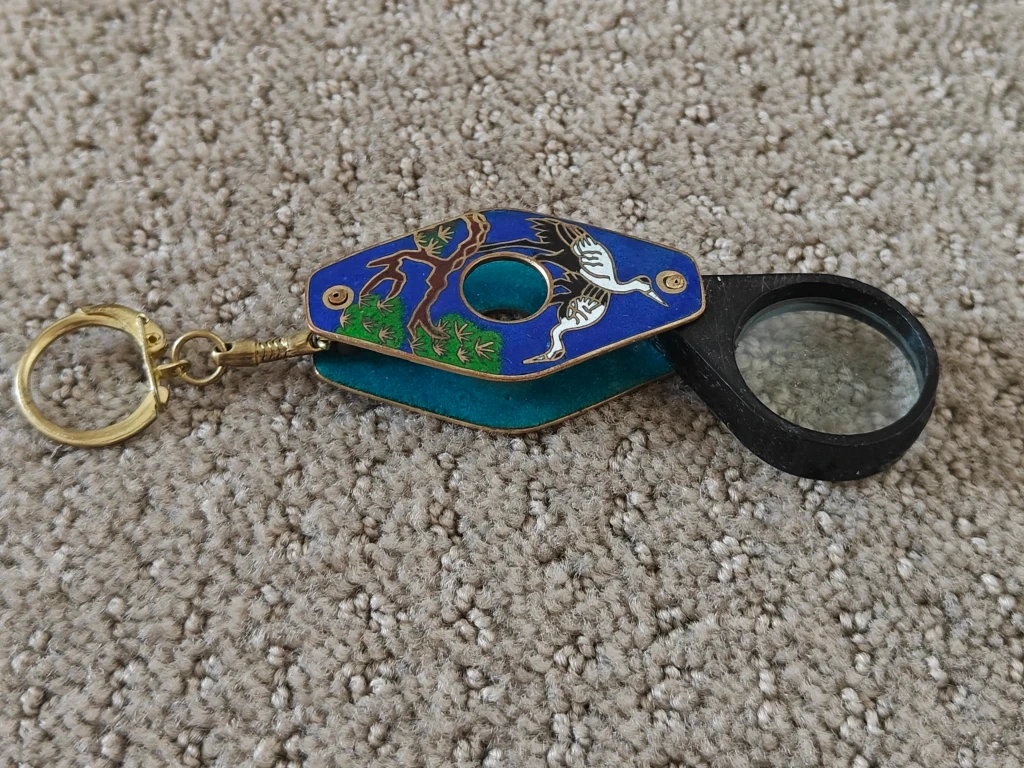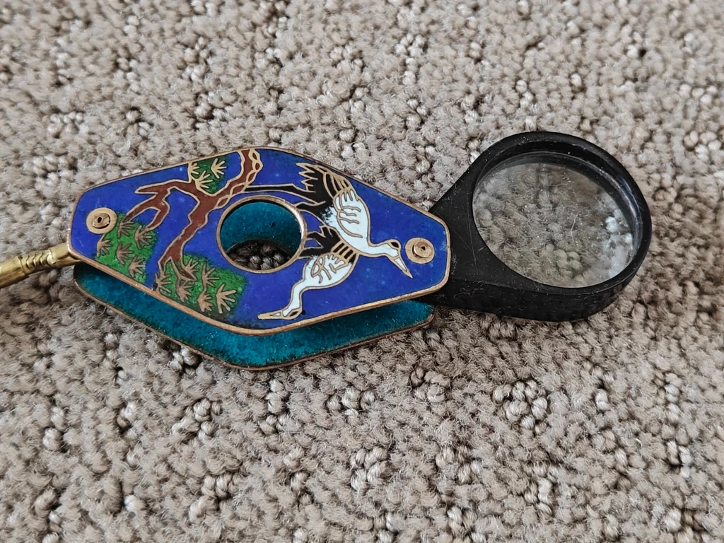 I am selling a Vintage Cloisonné Blue Enamel Pocket Magnifying Glass with an Exquisite Chinese Crane and Floral Art Design in excellent condition. Add a touch of timeless elegance and practicality to your collection with this exquisite vintage pocket magnifying glass. This piece is a beautiful example of the intricate art of cloisonné, featuring a vibrant blue enamel base adorned with a detailed Asian design.