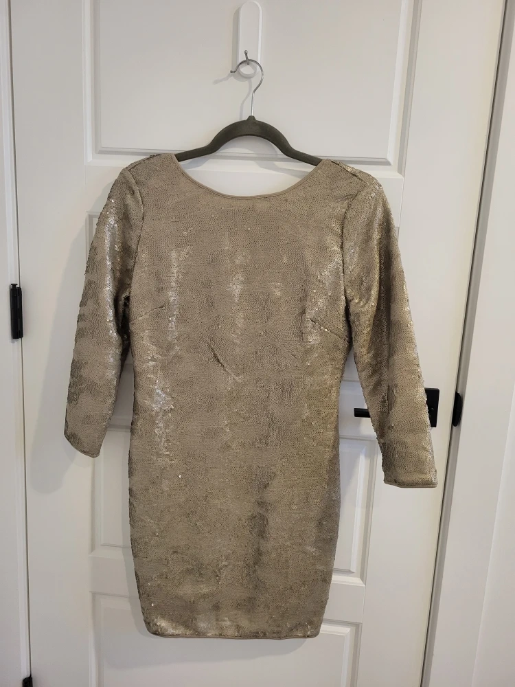 This is a sequin mini dress in a size M! It's a stunning piece that's perfect for parties or special occasions. The dress features a beautiful sequin design that catches the light and adds a touch of glamour. It's in excellent condition and ready to make you shine!