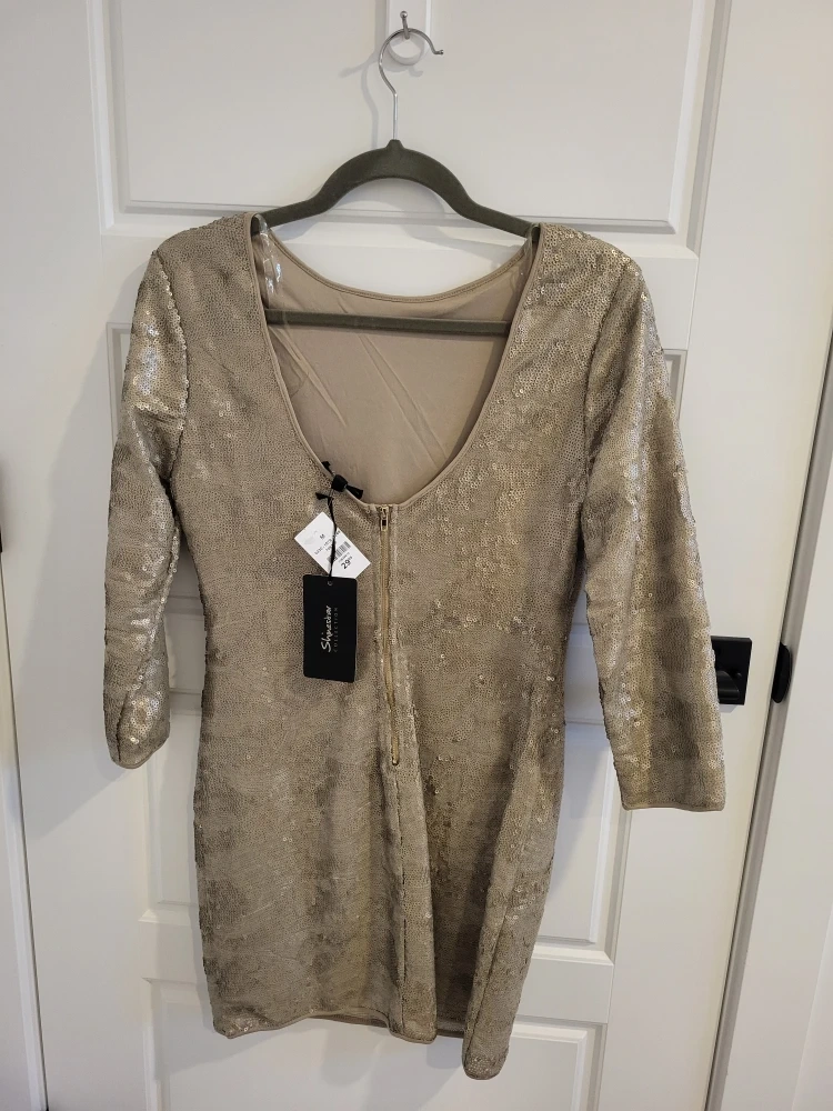 This is a sequin mini dress in a size M! It's a stunning piece that's perfect for parties or special occasions. The dress features a beautiful sequin design that catches the light and adds a touch of glamour. It's in excellent condition and ready to make you shine!