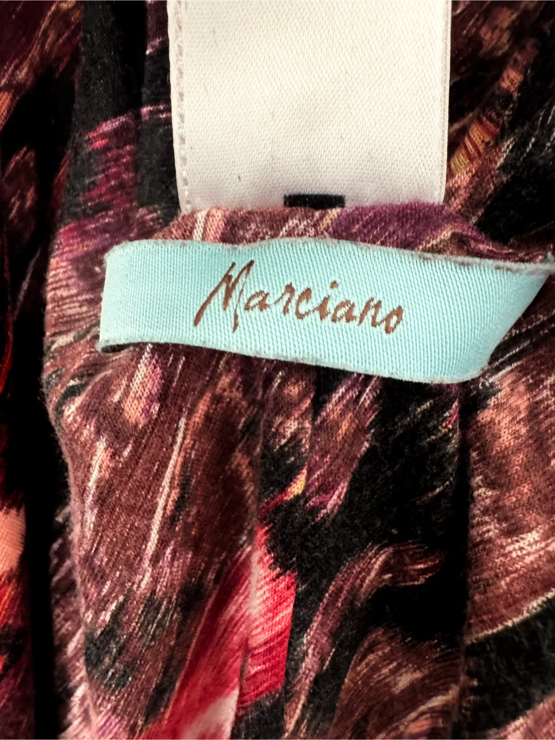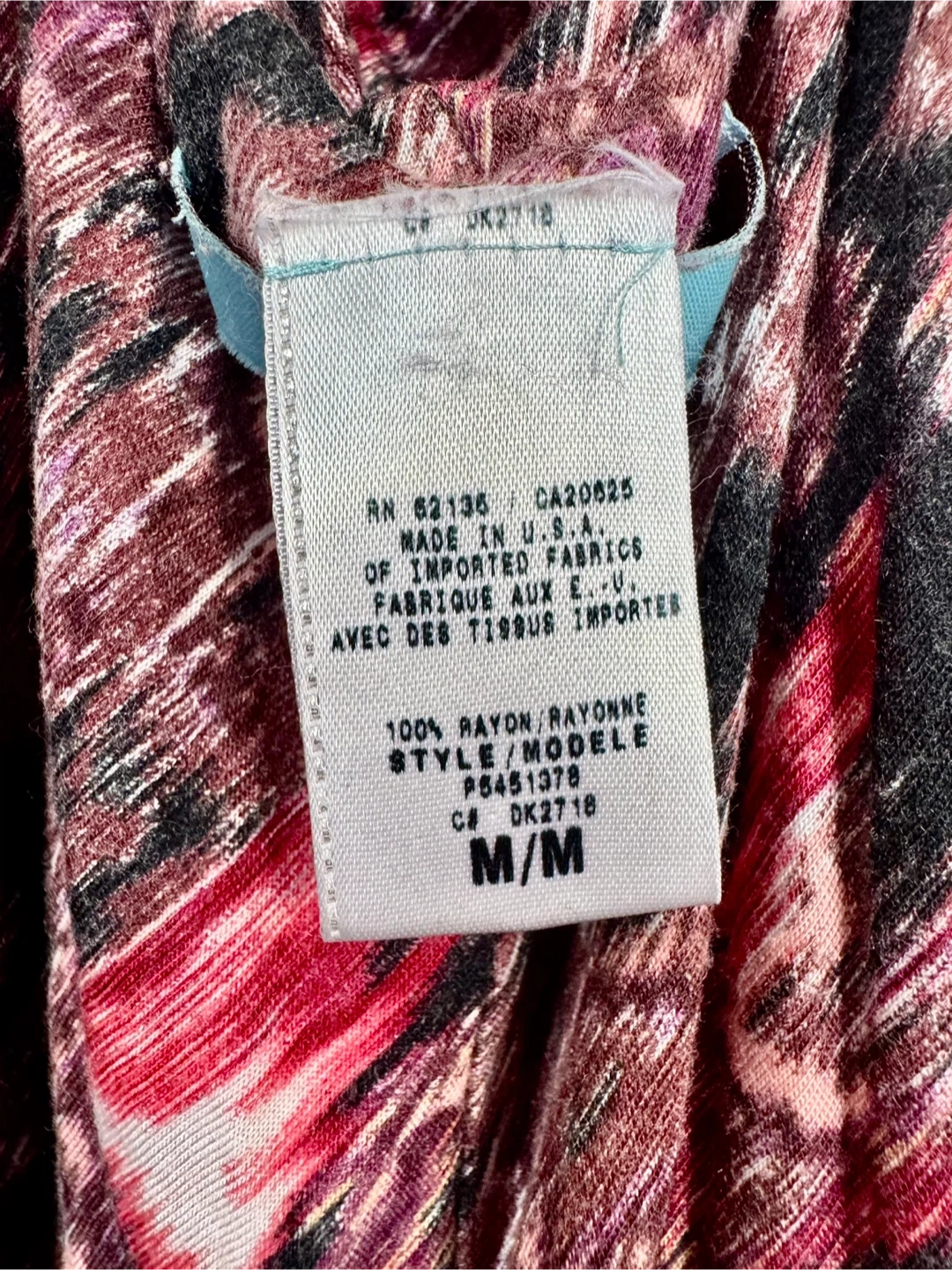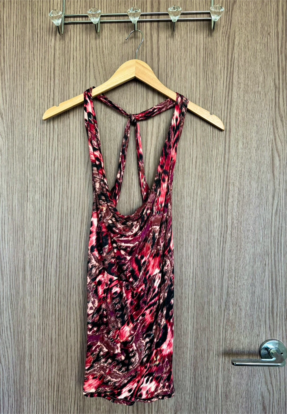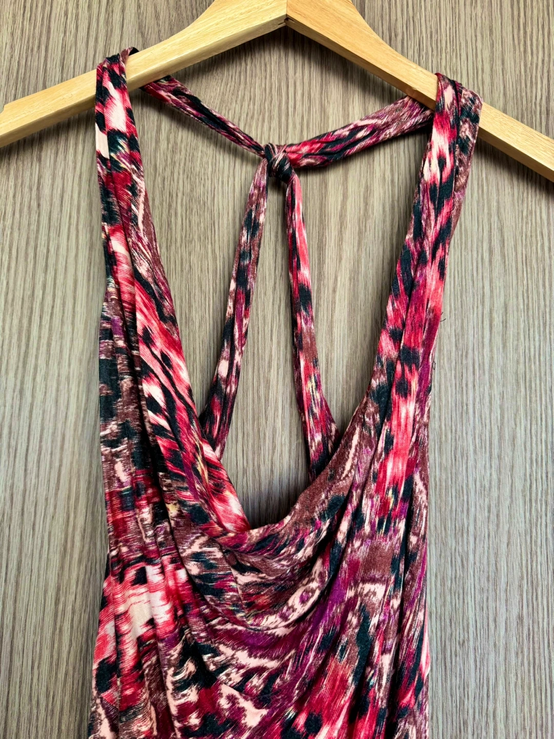 Make a statement with this luxury boho-chic draped halter top/mini dress, featuring a striking red-black-cream abstract print and a beautifully draped cowl front with an open, strappy back.