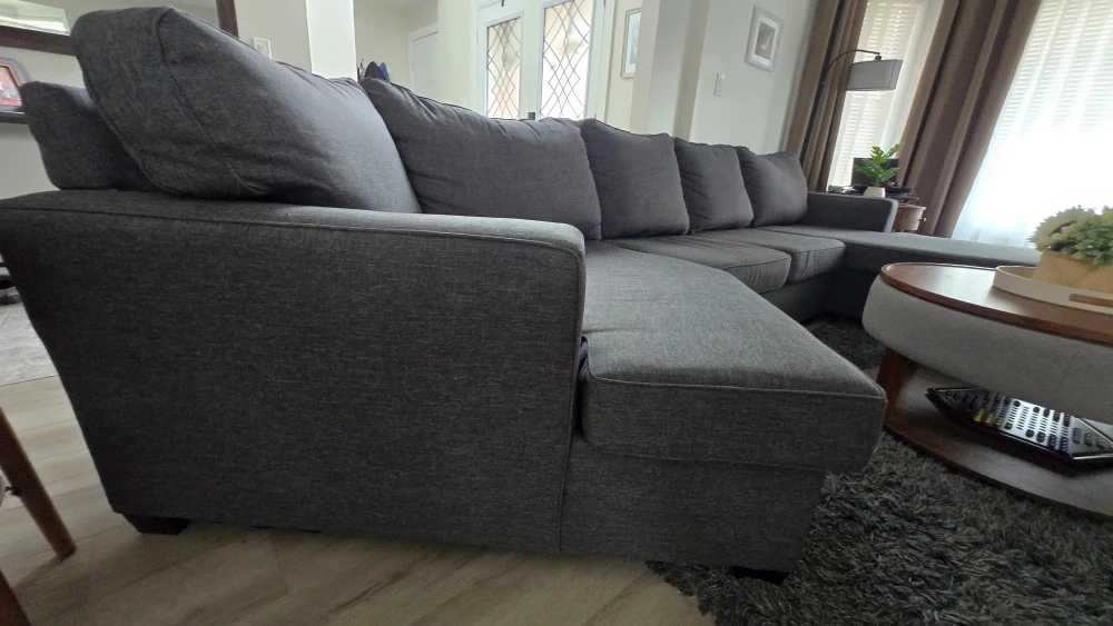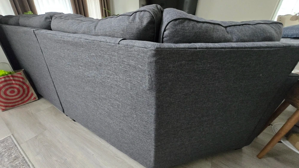 Selling a comfy grey sectional sofa! It's in great condition and would be perfect for a living room or entertainment area. It features a chaise lounge on one side and an angled lounge on the opposite side, making it ideal for relaxing. The fabric is a neutral grey.