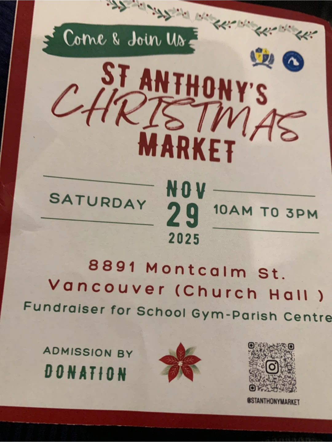 Come join us at St Anthony's Christmas Market on Saturday, November 29, 2025, from 10 AM to 3 PM! It's located at 8891 Montcalm St, Vancouver (Church Hall). Admission by donation, and it's a fundraiser for the school gym-parish centre