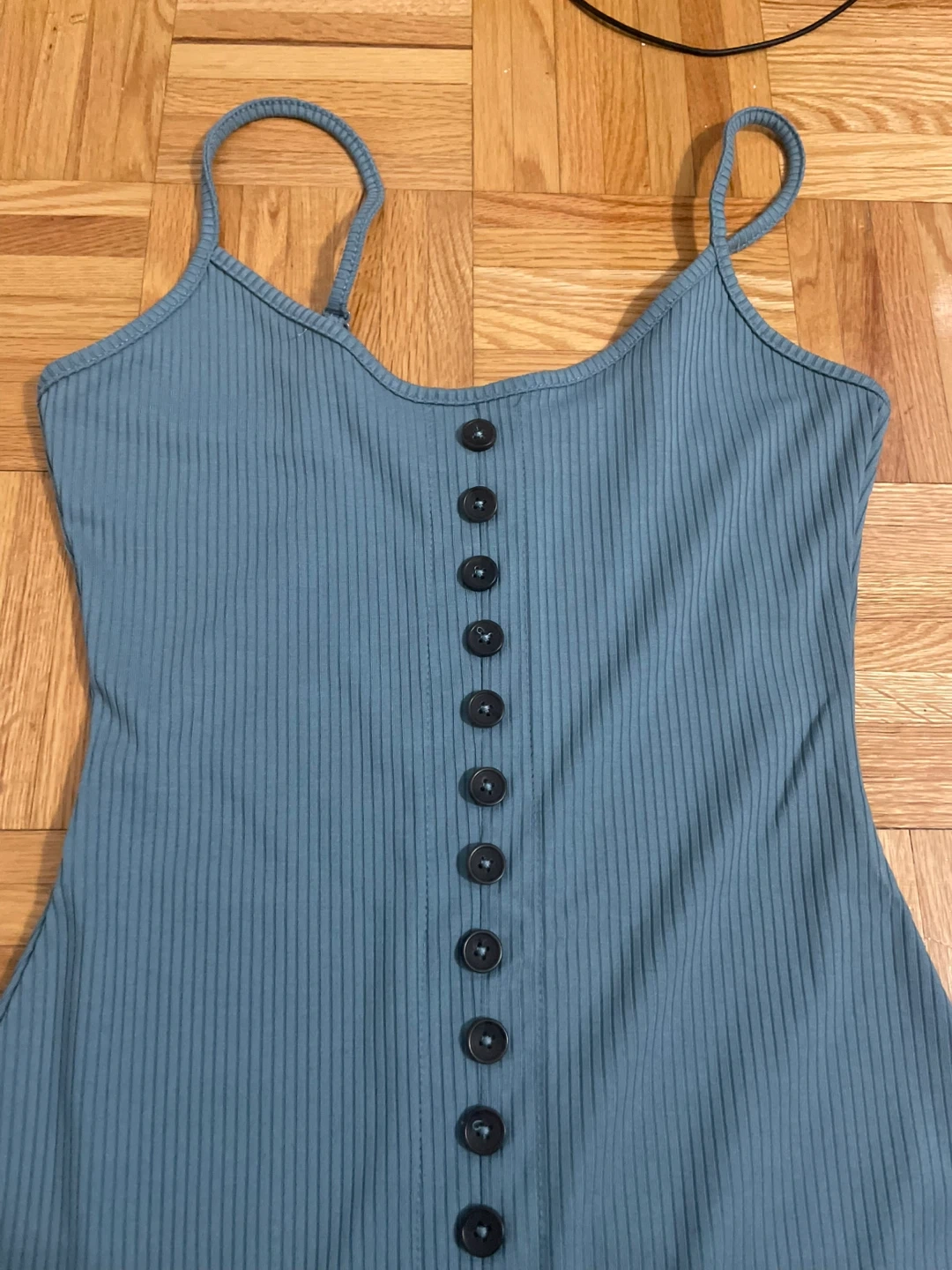 Here's a cute blue dress with a ribbed texture and button-down detailing!