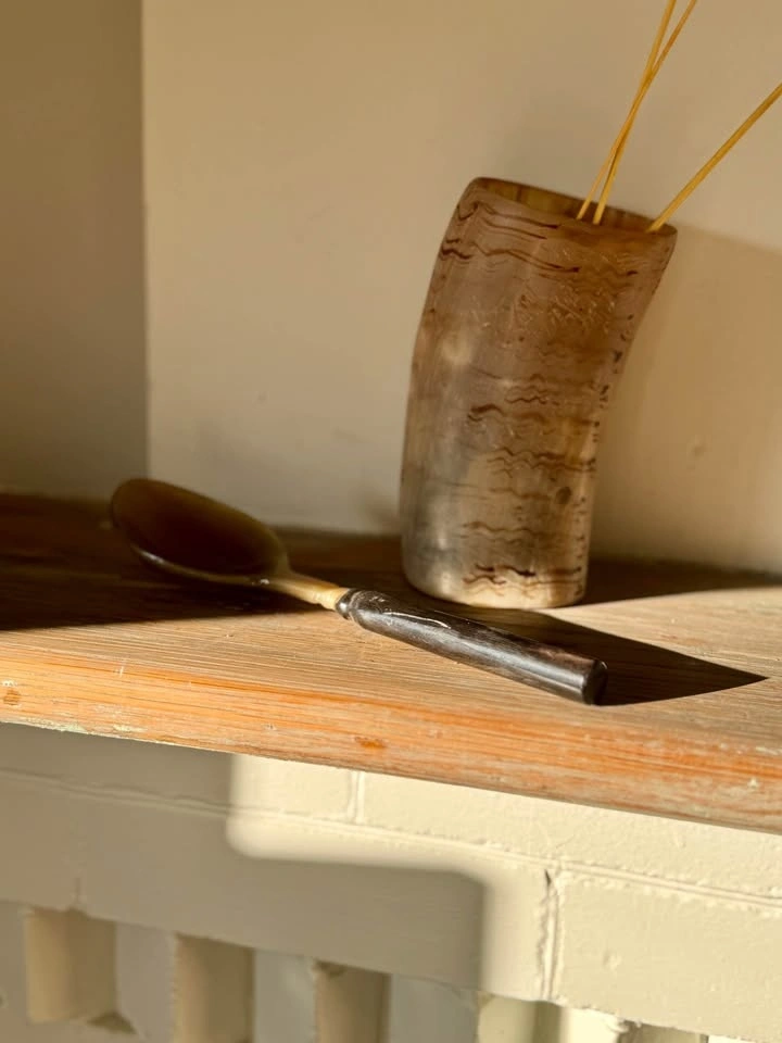 Vintage natural horn vessel / vase with a smooth pressed-flat base. Warm translucent tones and organic grain throughout. Great for rustic decor, Viking-style displays, cabin or lodge accents, or as a collectible horn vessel, or as a vase or stand alone as a home decor accent Material: Natural animal horn Condition: Good vintage condition with natural variations typical of horn Cash only Porch pick up Christie St and St. Clair West Ave (10 min walk from St. Clair WEST Subway station).