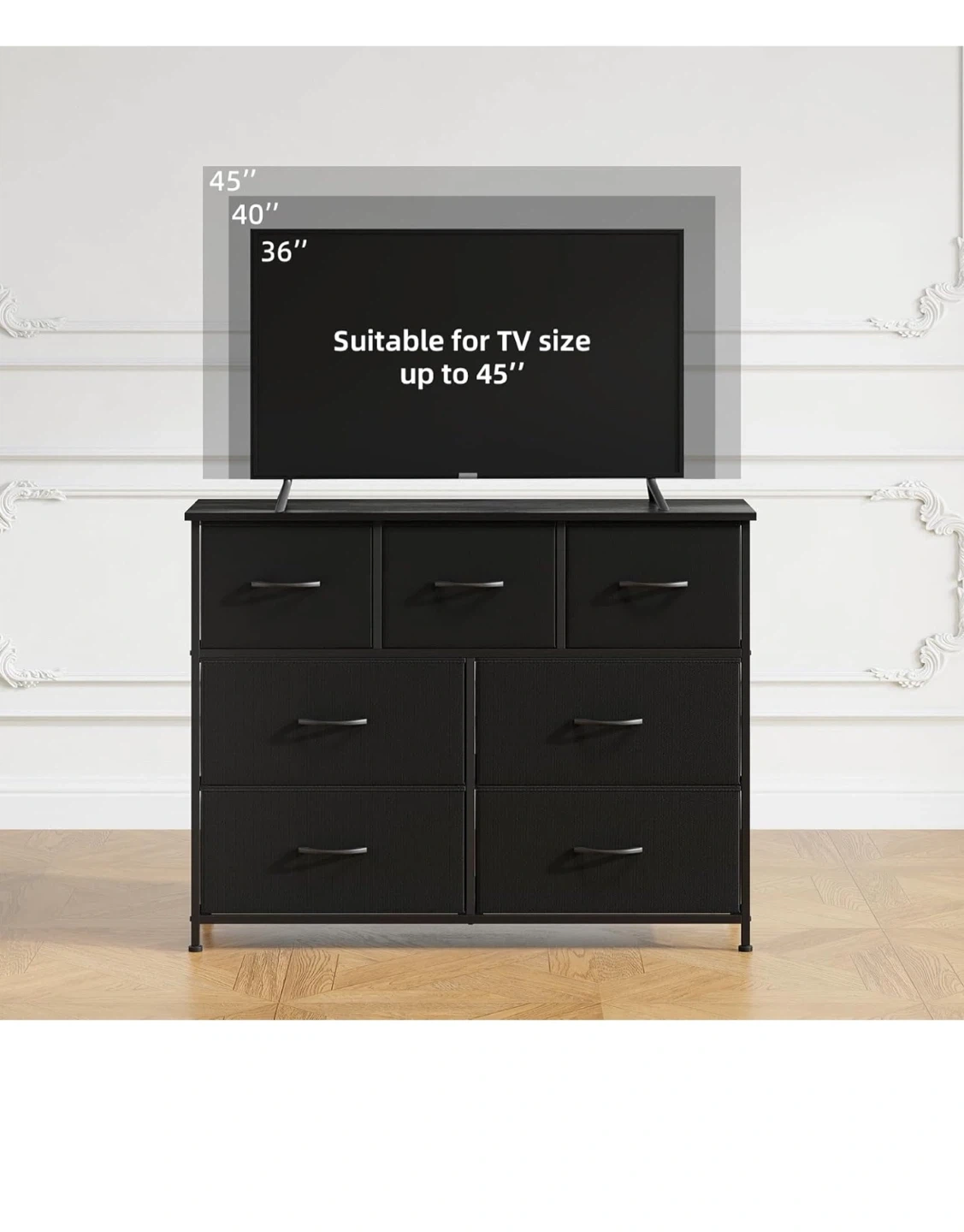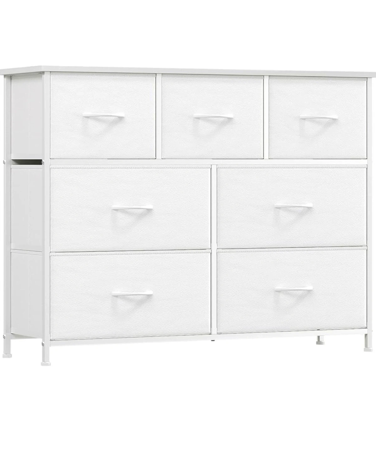 This dresser is perfect for you! It features seven fabric drawers to keep your clothes and accessories organized. The dresser is white and measures 39.4 inches wide, 11.8 inches deep, and 30.3 inches tall. The smaller drawers are 10.8" x 11.8" x 8.7" and the larger drawers are 10.8" x 18.1" x 8.7".. Drawer is FABRIC