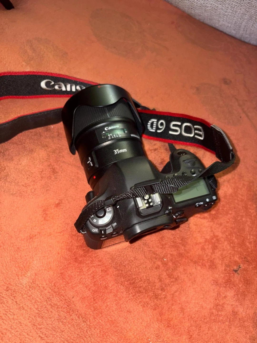 Selling a Canon EOS 6D camera, complete with a 35mm lens and a 135mm lens. Also included are a camera strap, battery charger, small tripod and camera bag. Great setup for photography enthusiasts! Canon EOS 6D camera in excellent condition.