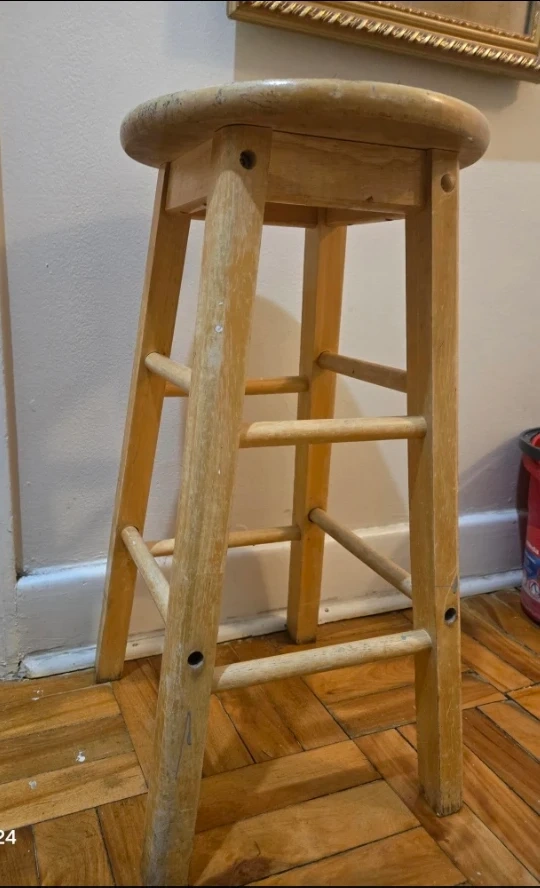 Selling a simple wooden stool. It's perfect for adding a bit of height or as an extra seat. It shows some signs of use, but it's still sturdy and ready for a new purpose