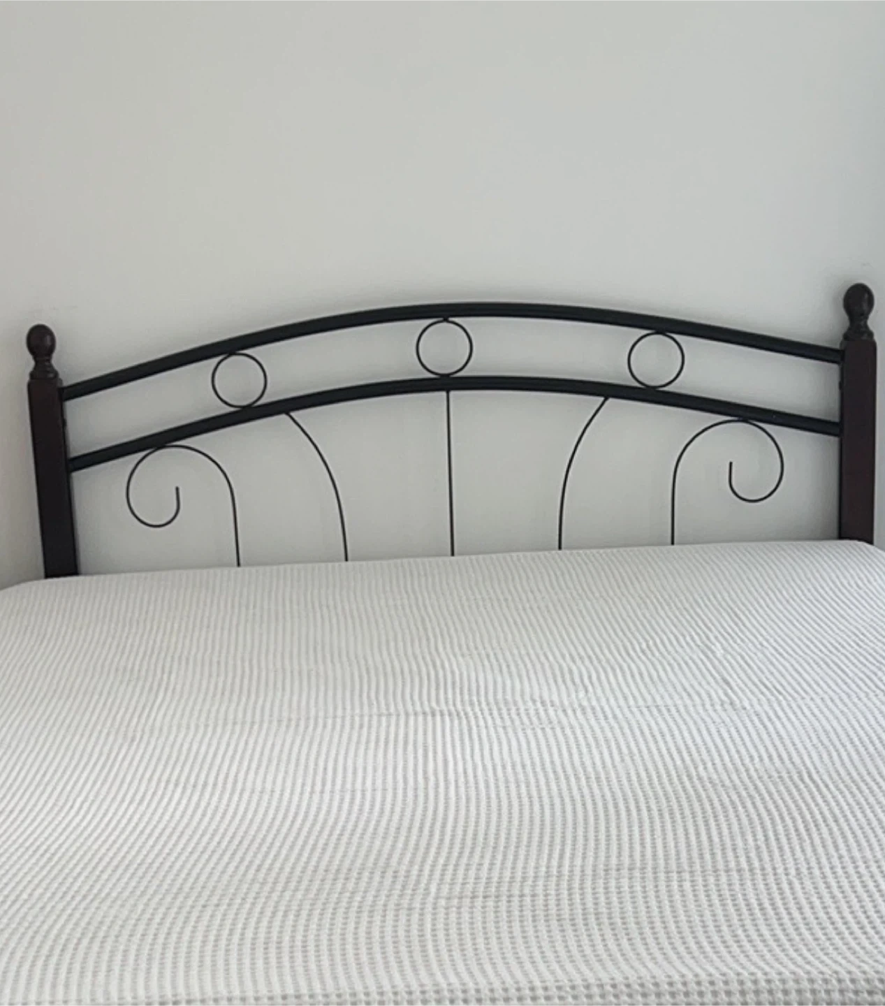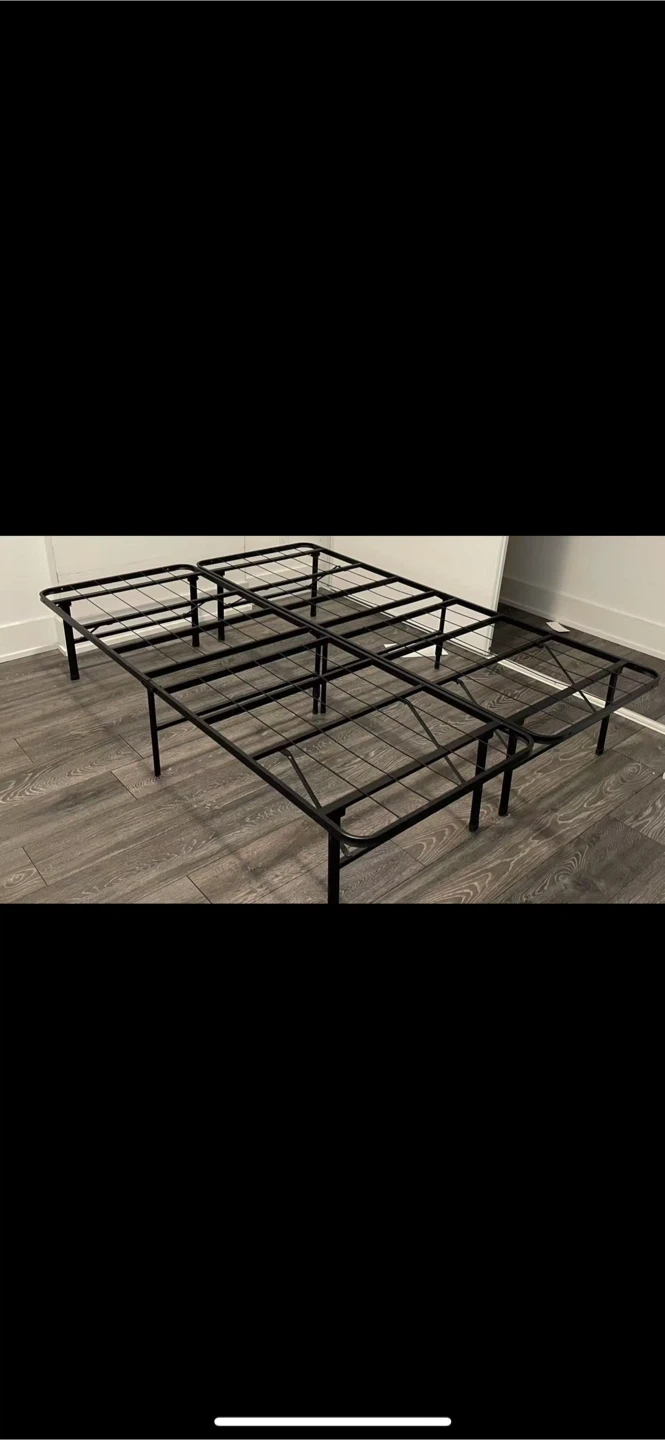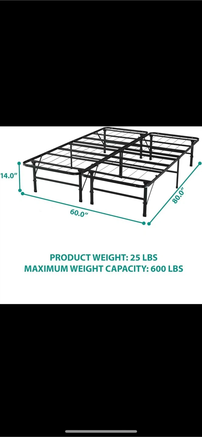 Selling a queen-size metal bed frame in black. It's in great shape and ready to go! The frame measures 60" x 80" and is 14" tall. It can support up to 600 lbs.