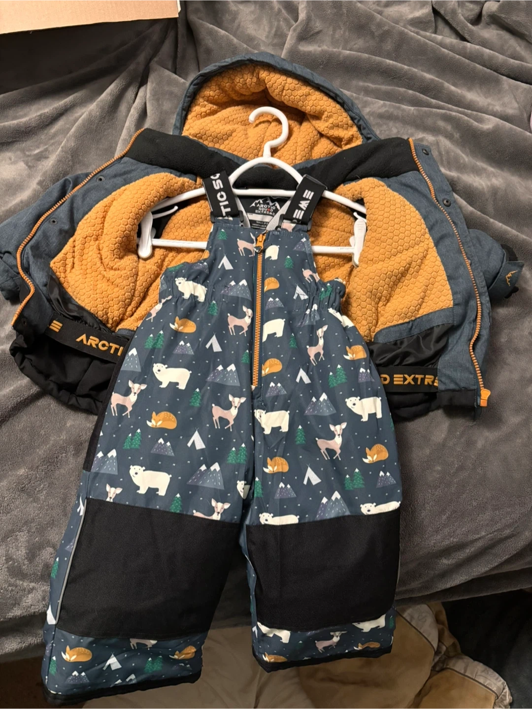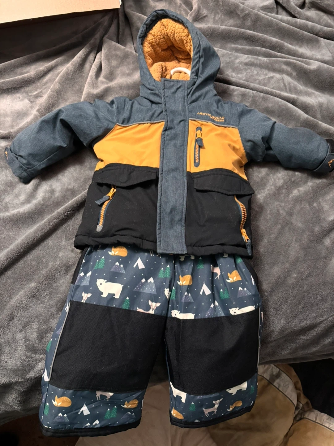 Keep your little one warm and cozy with this Arctic Squad snowsuit set! The set includes a jacket and snow pants with a cute animal print. It is size 2T Perfect for winter adventures!
