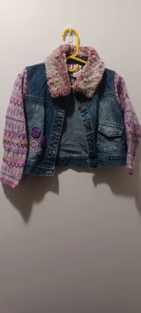 Cute denim jacket with unique knit sleeves and a soft faux fur collar! It's in great condition and ready for a new home. The jacket features a classic denim look with a modern twist, perfect for adding a touch of style to any outfit.