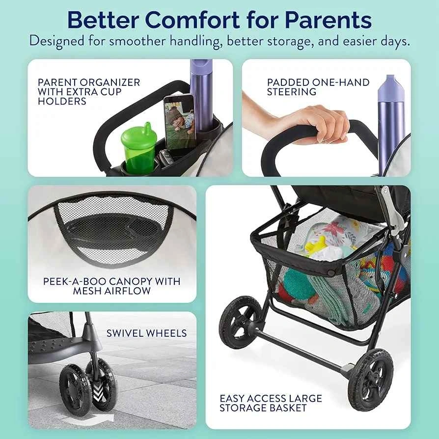 It has all of the important full-size stroller features but in a smaller, more nimble design with an ultra-compact fold. The Kolcraft Cloud Sport Lightweight Stroller has both a child tray and a parent tray for easy storage while you are on the move, plus an extra-large storage basket to keep all your things handy while on the go.
