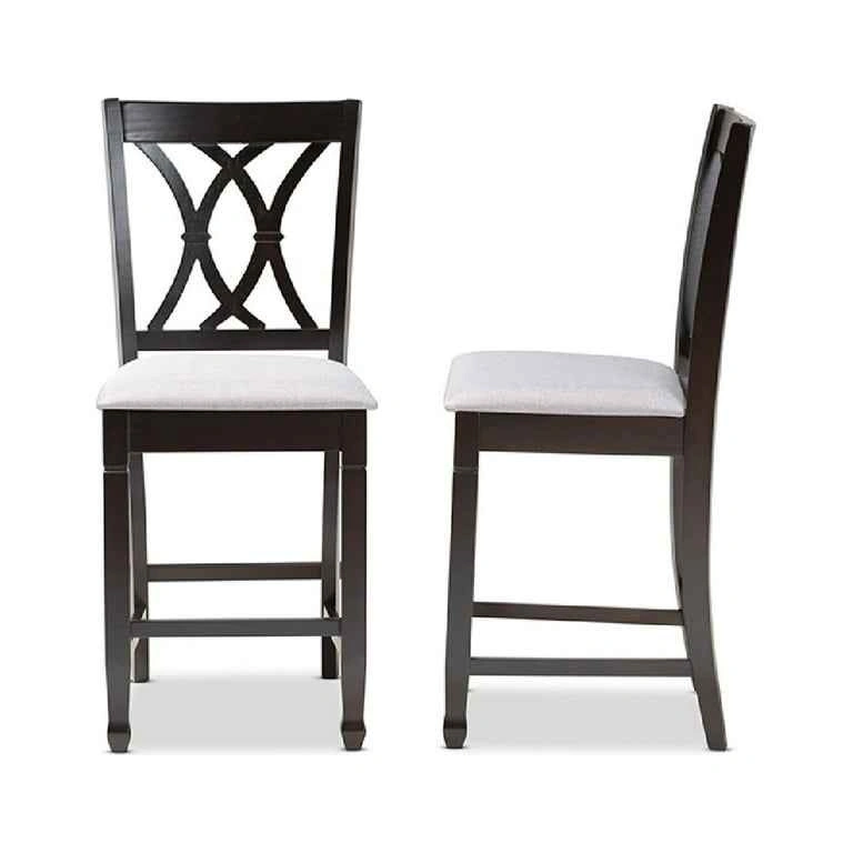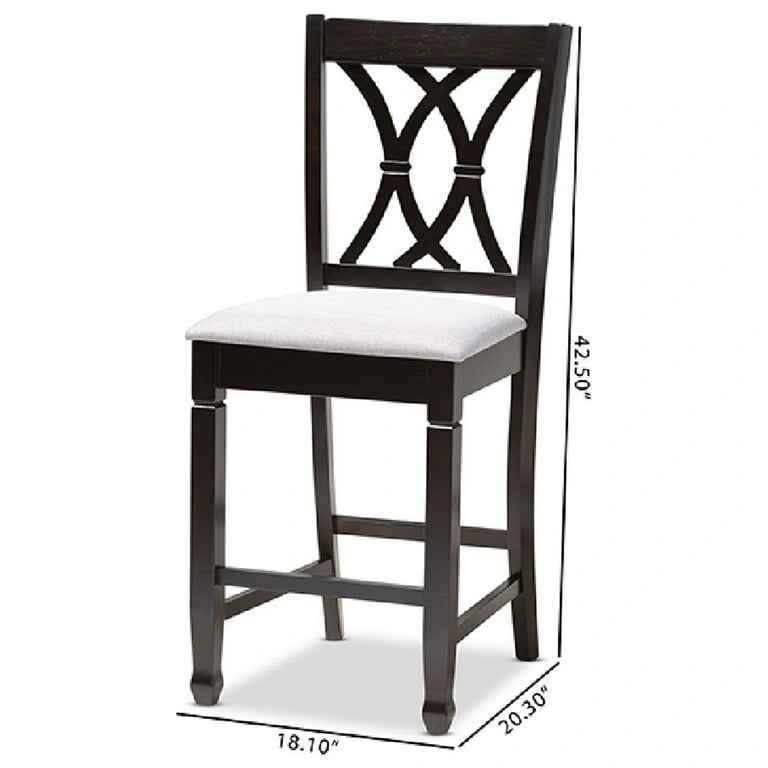 Baxton Studio Reneau Modern and Contemporary Gray Fabric Upholstered Espresso Brown Finished Wood Counter Height Pub. Featuring an exquisitely crafted frame, the Reneau pub chair adds elegance to any dining space. This solid rubberwood chair displays a sleek espresso brown finish that complements the light polyester fabric upholstery. Designed to add both comfort and style to your dining space. Number F59* Feel free to message if you have any questions!